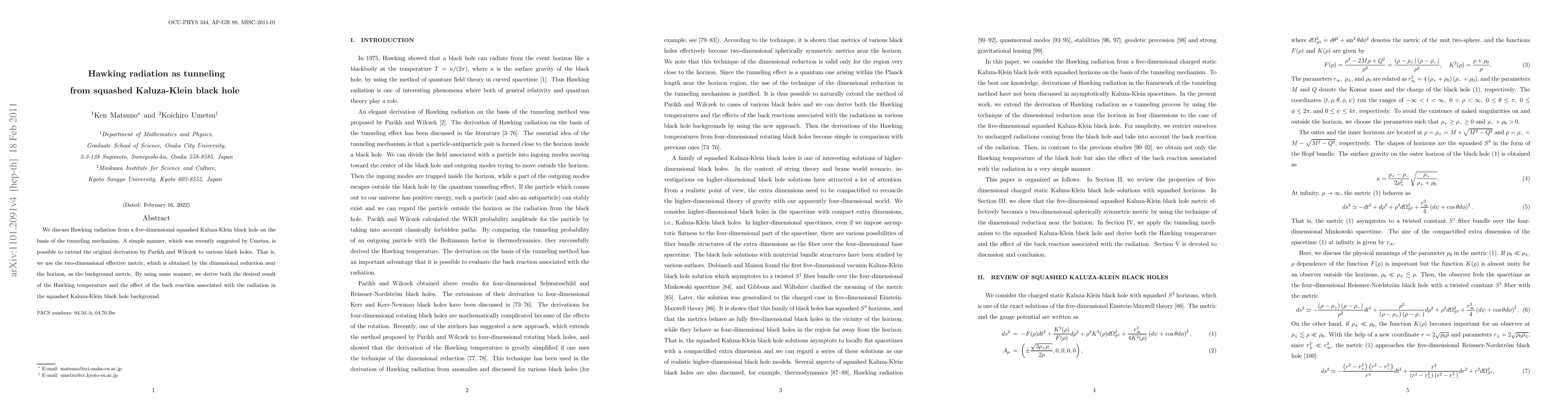We discuss Hawking radiation from a five-dimensional squashed Kaluza-Klein black hole on the basis of the tunneling mechanism. A simple manner, which was recently suggested by Umetsu, is possible to extend the original derivation by Parikh and Wilczek to various black holes. That is, we use the two-dimensional effective metric, which is obtained by the dimensional reduction near the horizon, as the background metric. By using same manner, we derive both the desired result of the Hawking temperature and the effect of the back reaction associated with the radiation in the squashed Kaluza-Klein black hole background.