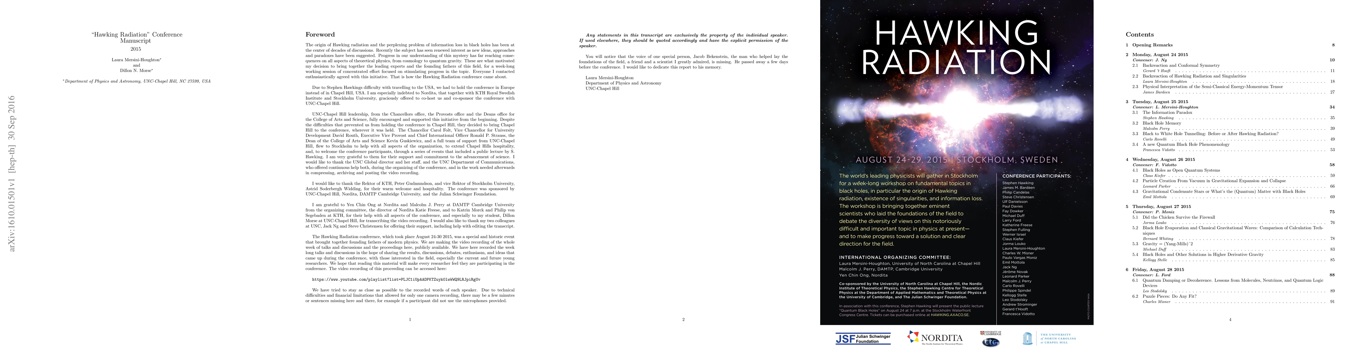 This paper presents proceedings from a 2015 conference on Hawking radiation in Stockholm, Sweden, featuring video recordings of talks, discussions, and communications with implications for young researchers.