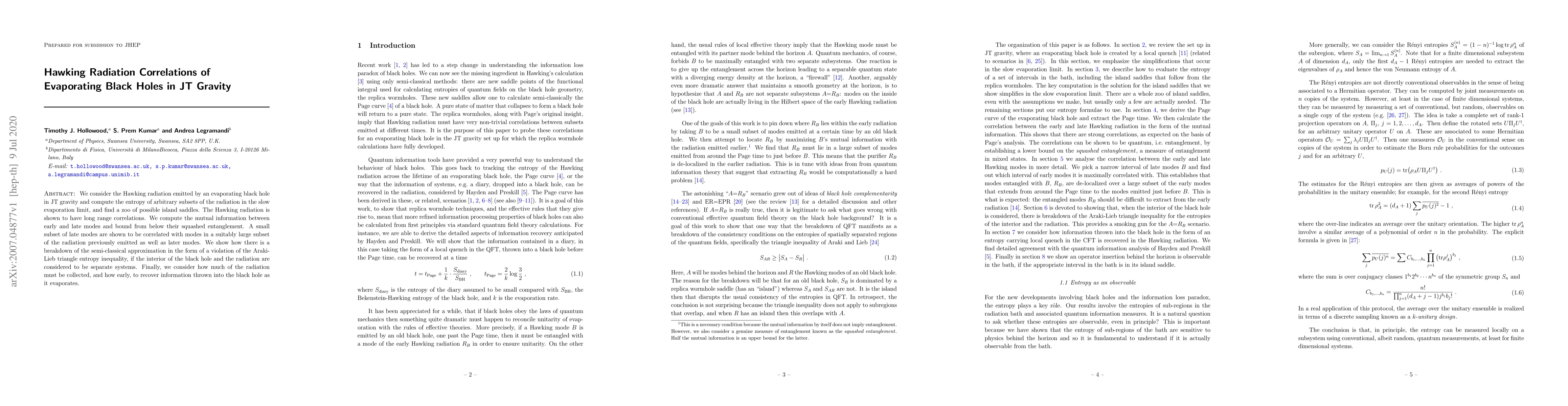 We consider the Hawking radiation emitted by an evaporating black hole in JT gravity and compute the entropy of arbitrary subsets of the radiation in the slow evaporation limit, and find a zoo of possible island saddles. The Hawking radiation is shown to have long range correlations. We compute the mutual information between early and late modes and bound from below their squashed entanglement. A small subset of late modes are shown to be correlated with modes in a suitably large subset of the radiation previously emitted as well as later modes. We show how there is a breakdown of the semi-classical approximation in the form of a violation of the Araki-Lieb triangle entropy inequality, if the interior of the black hole and the radiation are considered to be separate systems. Finally, we consider how much of the radiation must be collected, and how early, to recover information thrown into the black hole as it evaporates.