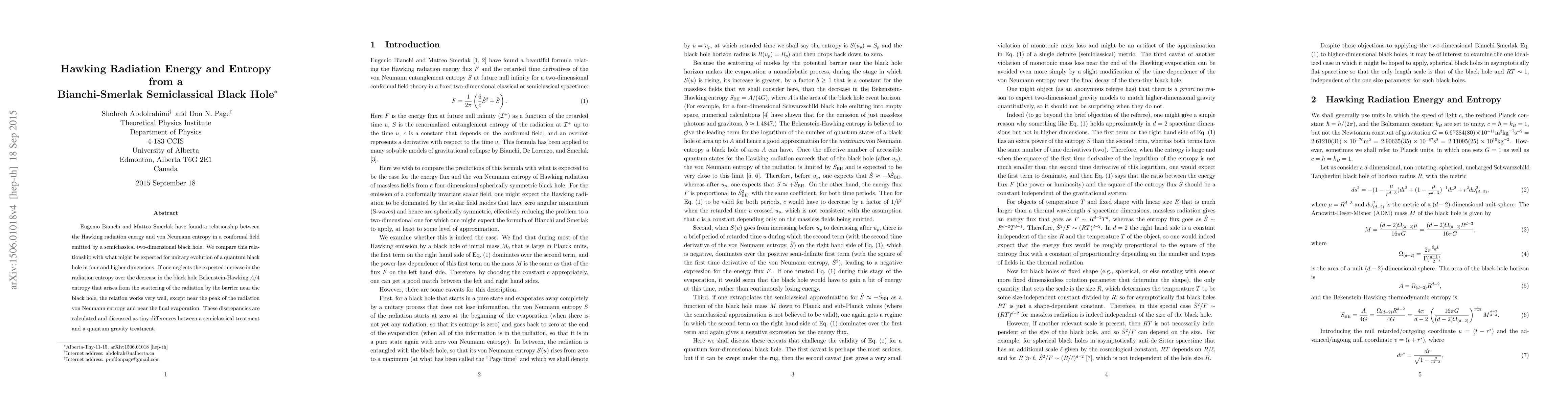 Eugenio Bianchi and Matteo Smerlak have found a relationship between the Hawking radiation energy and von Neumann entropy in a conformal field emitted by a semiclassical two-dimensional black hole. We compare this relationship with what might be expected for unitary evolution of a quantum black hole in four and higher dimensions. If one neglects the expected increase in the radiation entropy over the decrease in the black hole Bekenstein-Hawking A/4 entropy that arises from the scattering of the radiation by the barrier near the black hole, the relation works very well, except near the peak of the radiation von Neumann entropy and near the final evaporation. These discrepancies are calculated and discussed as tiny differences between a semiclassical treatment and a quantum gravity treatment.