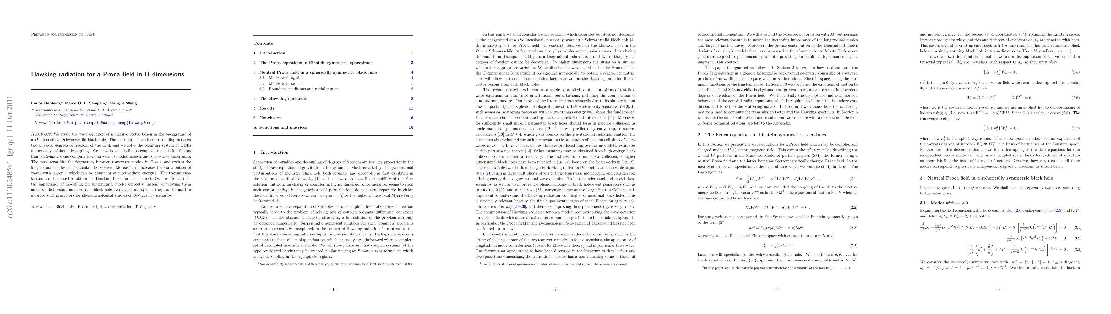 We study the wave equation of a massive vector boson in the background of a D-dimensional Schwarzschild black hole. The mass term introduces a coupling between two physical degrees of freedom of the field, and we solve the resulting system of ODEs numerically, without decoupling. We show how to define decoupled transmission factors from an S-matrix and compute them for various modes, masses and space-time dimensions. The mass term lifts the degeneracy between transverse modes, in D=4, and excites the longitudinal modes, in particular the s-wave. Moreover, it increases the contribution of waves with larger angular momentum, which can be dominant at intermediate energies. The transmission factors are then used to obtain the Hawking fluxes in this channel. Our results alert for the importance of modelling the longitudinal modes correctly, instead of treating them as decoupled scalars as in current black hole event generators; thus they can be used to improve such generators for phenomenological studies of TeV gravity scenarios.