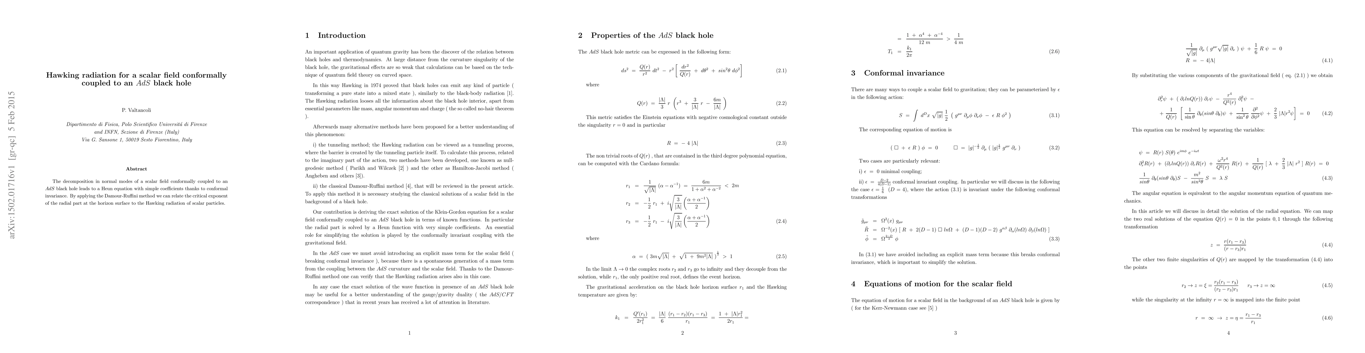The decomposition in normal modes of a scalar field conformally coupled to an AdS black hole leads to a Heun equation with simple coefficients thanks to conformal invariance. By applying the Damour-Ruffini method we can relate the critical exponent of the radial part at the horizon surface to the Hawking radiation of scalar particles.