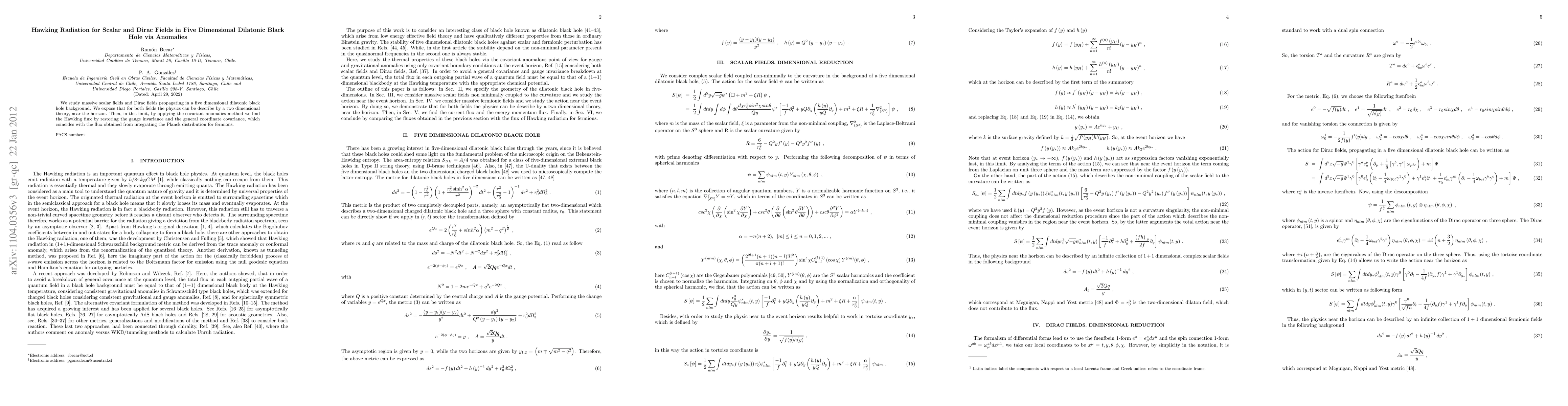 This research investigates massive scalar and Dirac fields in a five-dimensional dilatonic black hole. Utilizing covariant anomalies, it demonstrates that near the horizon, the physics can be encapsulated in a two-dimensional theory. The study finds that the Hawking flux, calculated via anomaly application, aligns with the flux derived from Planck distribution for fermions.