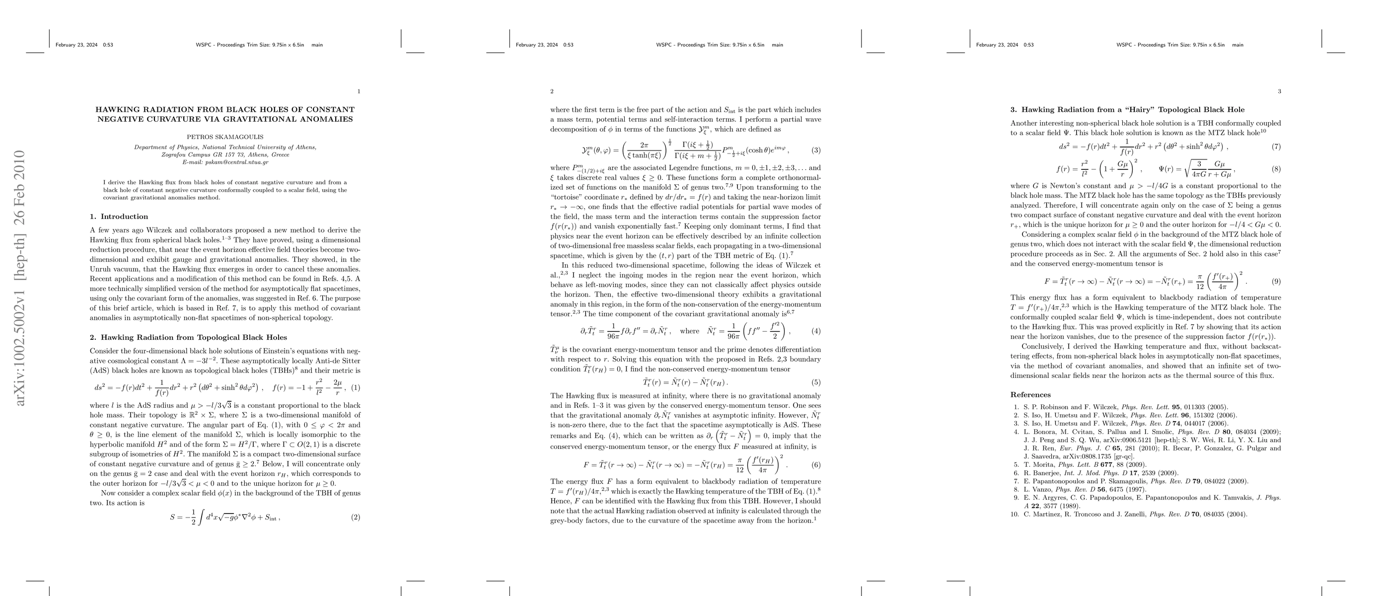 Summary: This paper derives the Hawking radiation flux from black holes with constant negative curvature, employing the covariant gravitational anomalies method, and extends the analysis to black holes conformally coupled with scalar fields.
