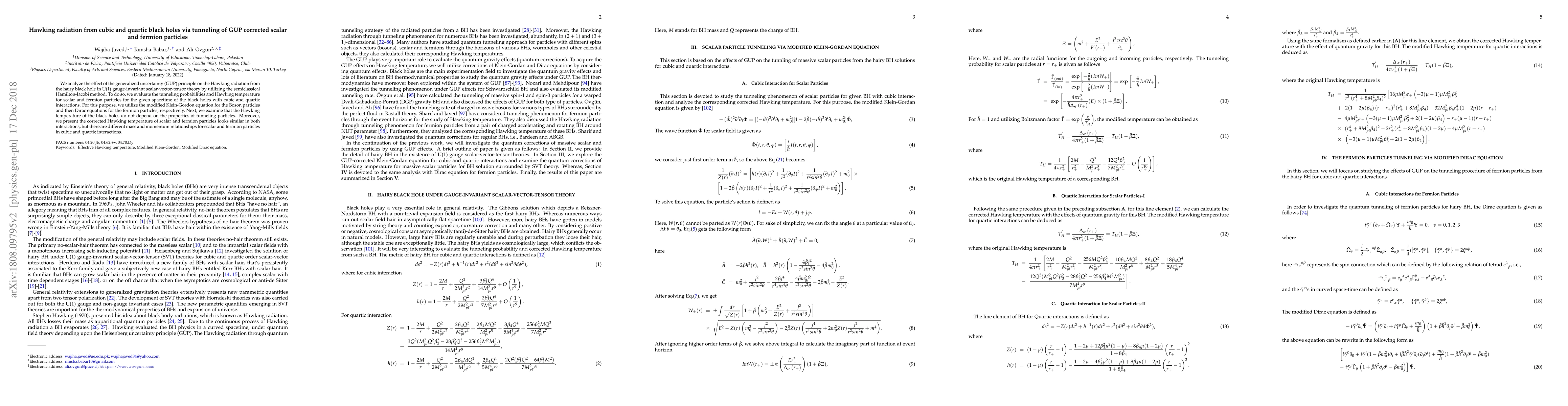 Summary: This research investigates the impact of the generalized uncertainty principle (GUP) on Hawking radiation from cubic and quartic hairy black holes using tunneling methods. It finds that the Hawking temperature is independent of tunneling particle properties, with similar corrected temperatures for scalar and fermion particles, albeit with different mass and momentum relationships in cubic and quartic interactions.