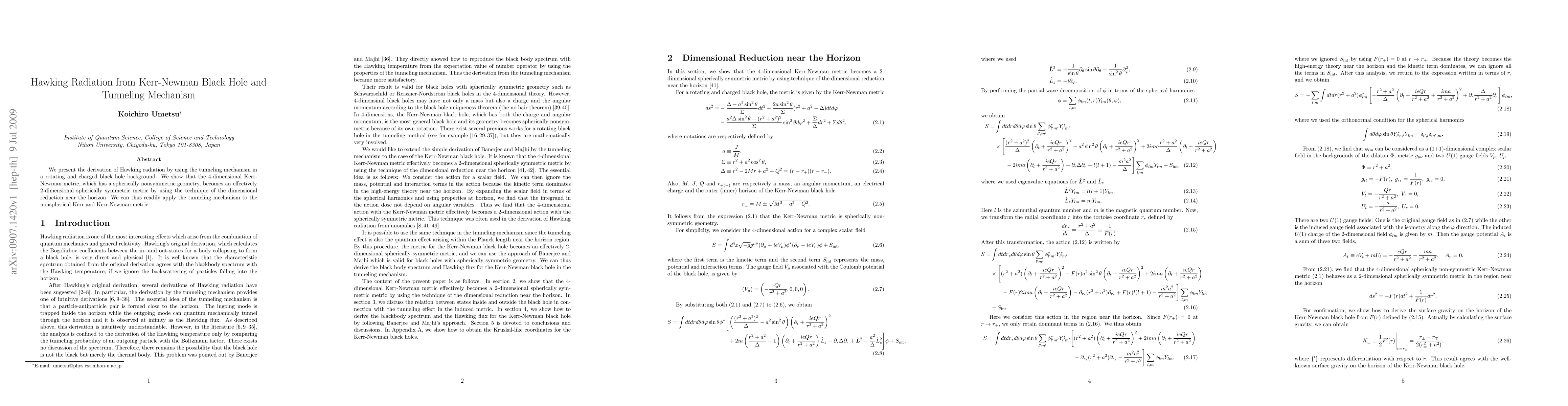 This paper derives Hawking radiation for a Kerr-Newman black hole using the tunneling mechanism, demonstrating that the 4-dimensional Kerr-Newman metric can be reduced to a 2-dimensional metric near the horizon, allowing for the application of tunneling methods to nonspherical black hole geometries.
