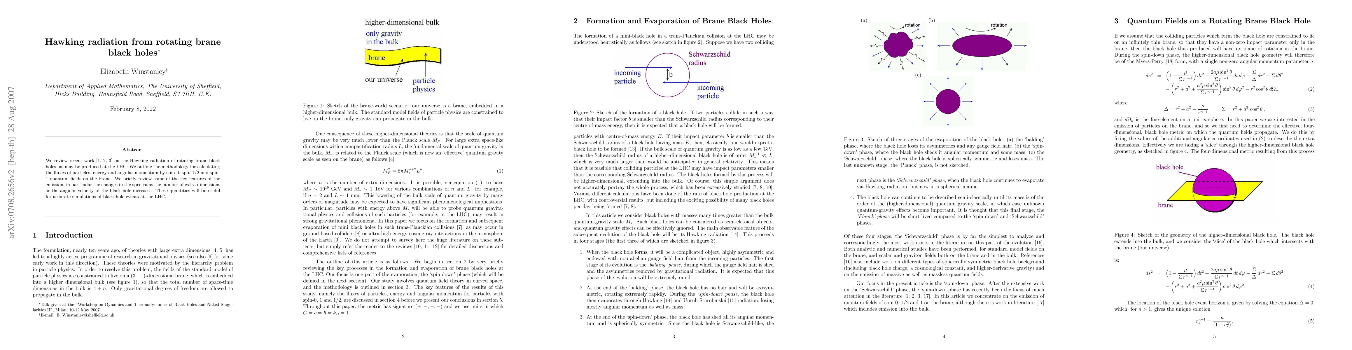 This paper reviews recent studies on Hawking radiation from rotating brane black holes, focusing on methodologies for calculating particle fluxes and energy/angular momentum emitted by various quantum fields. It highlights changes in emission spectra with extra dimensions and angular velocity, crucial for LHC black hole event simulations.