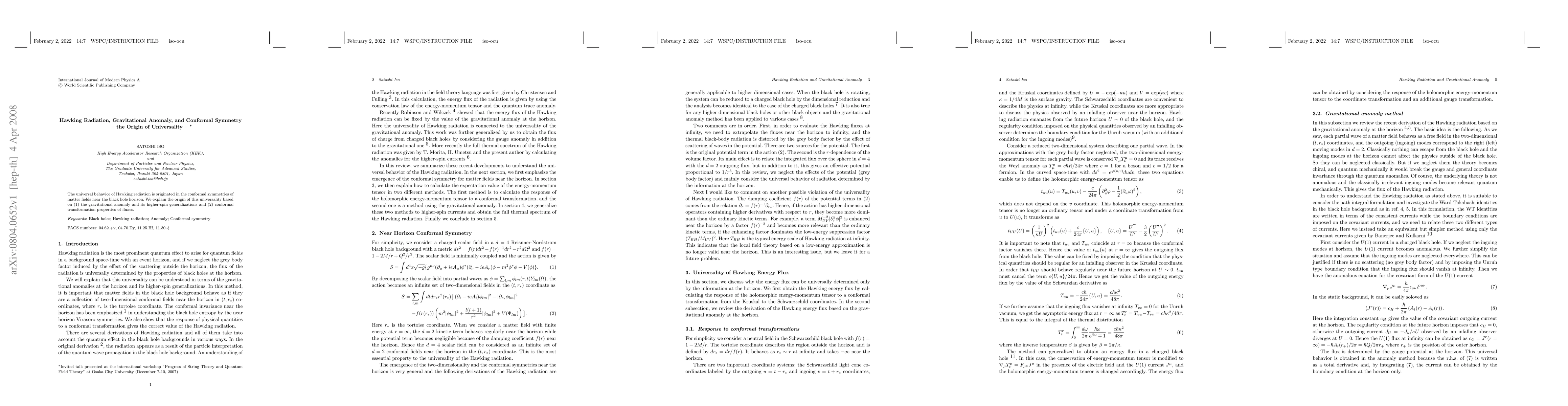 The universal behavior of Hawking radiation is originated in the conformal symmetries of matter fields near the black hole horizon. We explain the origin of this universality based on (1) the gravitational anomaly and its higher-spin generalizations and (2) conformal transformation properties of fluxes.