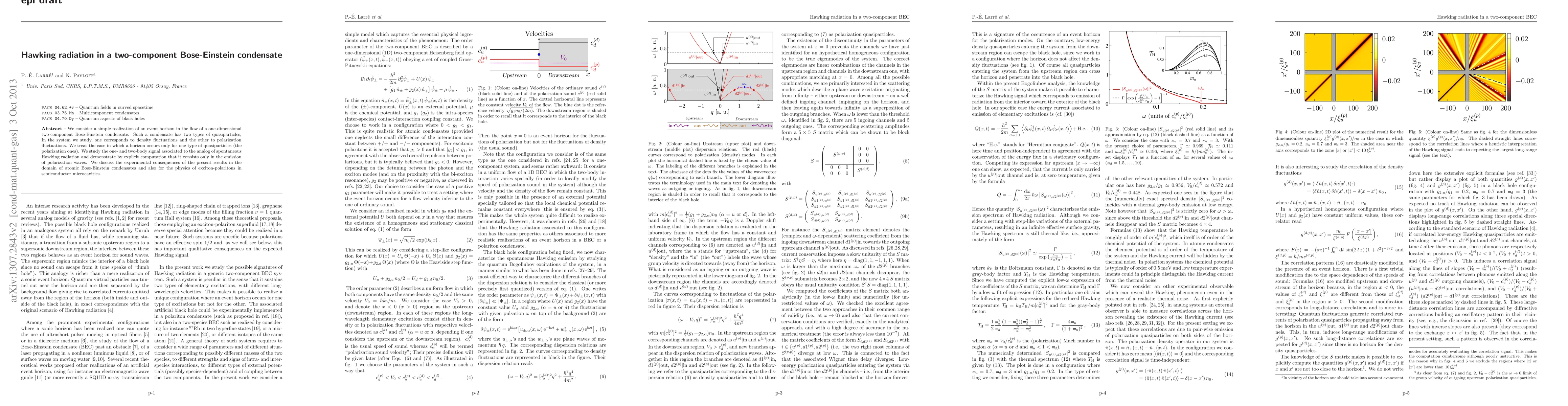 This paper investigates Hawking radiation in a one-dimensional two-component Bose-Einstein condensate, demonstrating that the analog of spontaneous Hawking radiation consists solely of emitted polarization waves. The study discusses potential experimental implications for atomic condensates and exciton-polaritons in semiconductor microcavities.