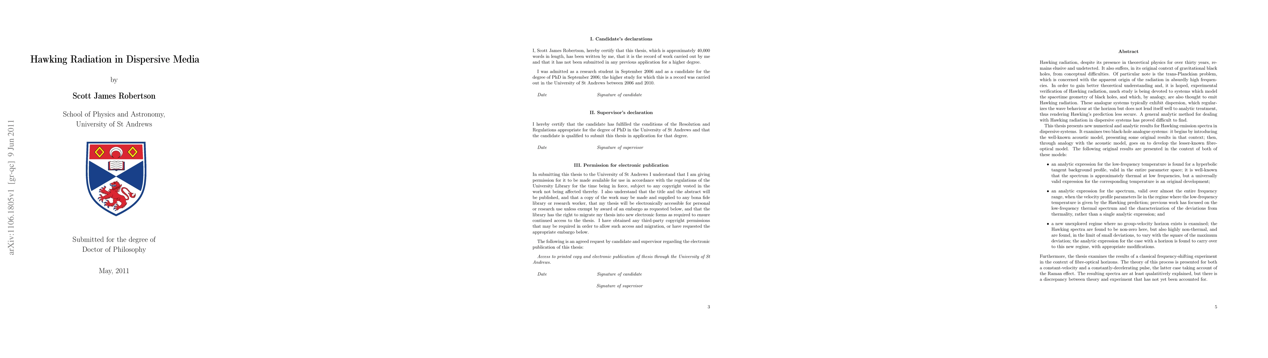 This paper investigates Hawking radiation in dispersive media, focusing on two analogue systems: an acoustic model and a fibre-optical model. It presents new numerical and analytic results to better understand Hawking emission spectra, aiming to address the trans-Planckian problem and improve theoretical predictions.