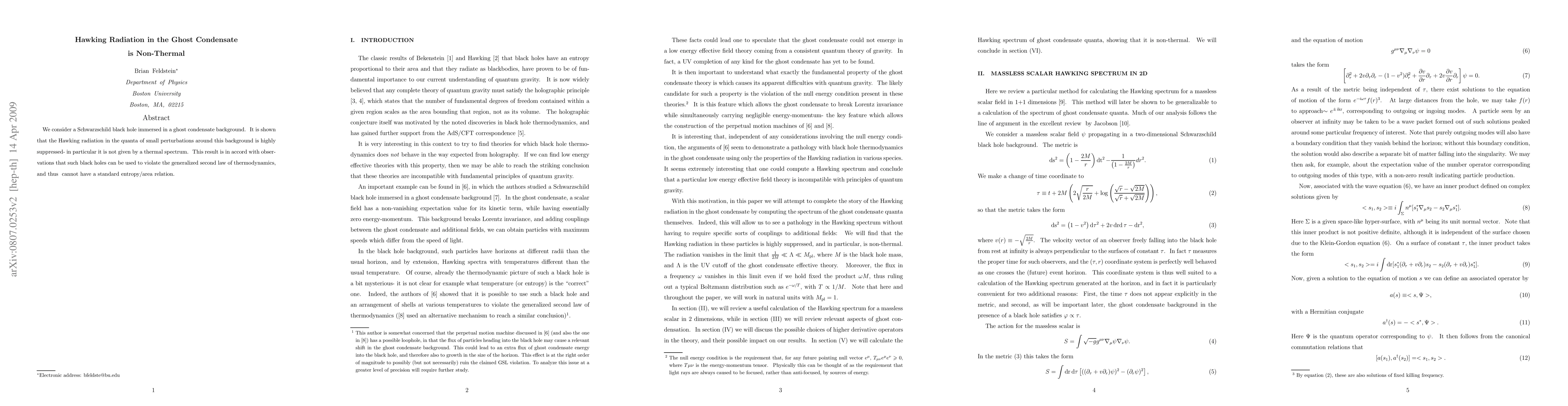 This paper explores a Schwarzschild black hole within a ghost condensate, demonstrating that Hawking radiation from small perturbations is significantly suppressed and non-thermal, aligning with observations that such black holes can violate the generalized second law of thermodynamics, lacking a standard entropy/area relation.