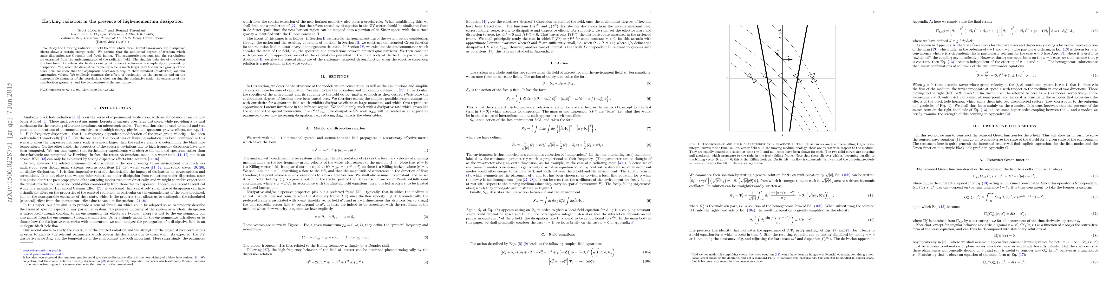 We study the Hawking radiation in field theories which break Lorentz invariance via dissipative effects above a certain energy scale. We assume that the additional degrees of freedom which cause dissipation are Gaussian and freely falling. The asymptotic spectrum and the correlations are extracted from the anticommutator of the radiation field. The singular behavior of the Green function found for relativistic fields as one point crosses the horizon is completely suppressed by dissipation. Yet, when the dissipative frequency scale is much larger than the surface gravity of the black hole, we show that the asymptotic observables acquire their standard (relativistic) vacuum expectation values. We explicitly compute the effects of dissipation on the spectrum and on the nonseparable character of the correlations when varying the dissipative scale, the extension of the near-horizon geometry, and the temperature of the environment.