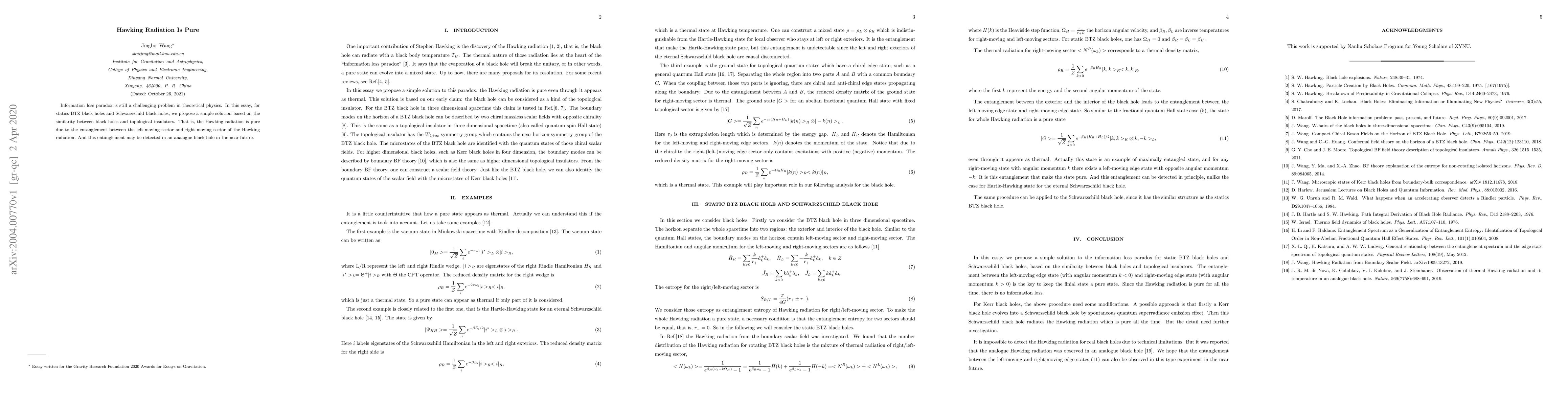 Information loss paradox is still a challenging problem in theoretical physics. In this essay, for statics BTZ black holes and Schwarzschild black holes, we propose a simple solution based on the similarity between black holes and topological insulators. That is, the Hawking radiation is pure due to the entanglement between the left-moving sector and right-moving sector of the Hawking radiation. And this entanglement may be detected in an analogue black hole in the near future.