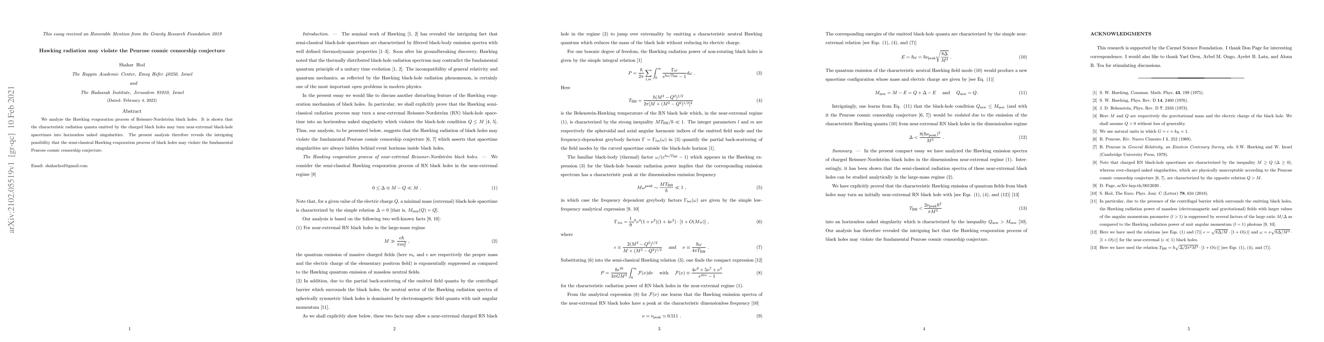 This paper investigates the Hawking evaporation of Reissner-Nordström black holes, suggesting that emitted radiation could transform near-extremal black holes into horizonless naked singularities, potentially violating the Penrose cosmic censorship conjecture.