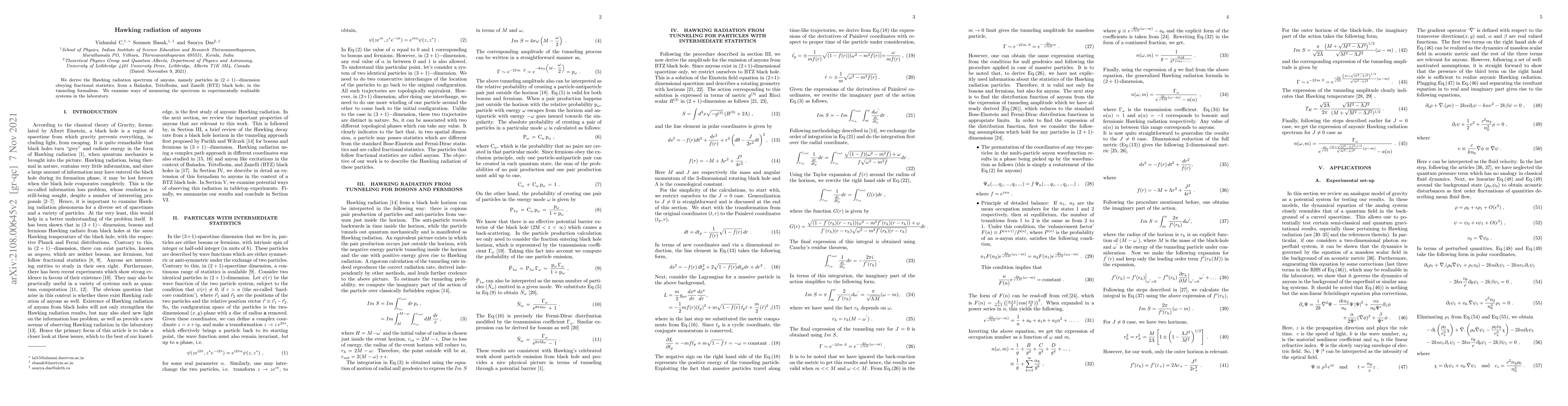 This paper derives the Hawking radiation spectrum for anyons, particles with fractional statistics, from a BTZ black hole using the tunneling formalism. It also discusses potential experimental methods to measure this spectrum in lab settings.