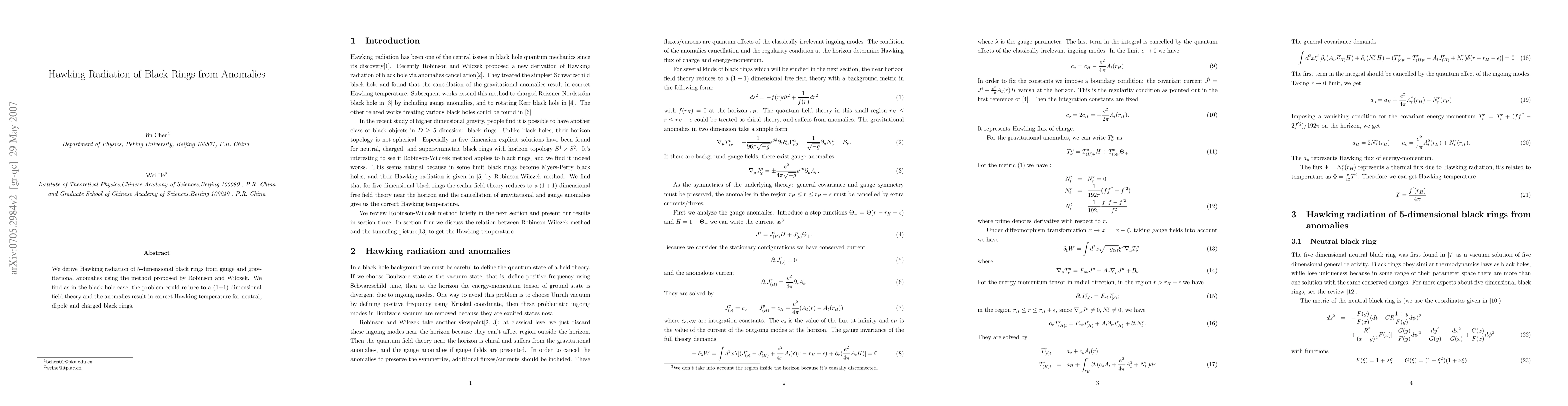 Summary: This paper derives Hawking radiation from 5-dimensional black rings via gauge and gravitational anomalies, employing Robinson and Wilczek's method, and shows that anomalies yield the correct Hawking temperature for neutral, dipole, and charged black rings, akin to black holes.