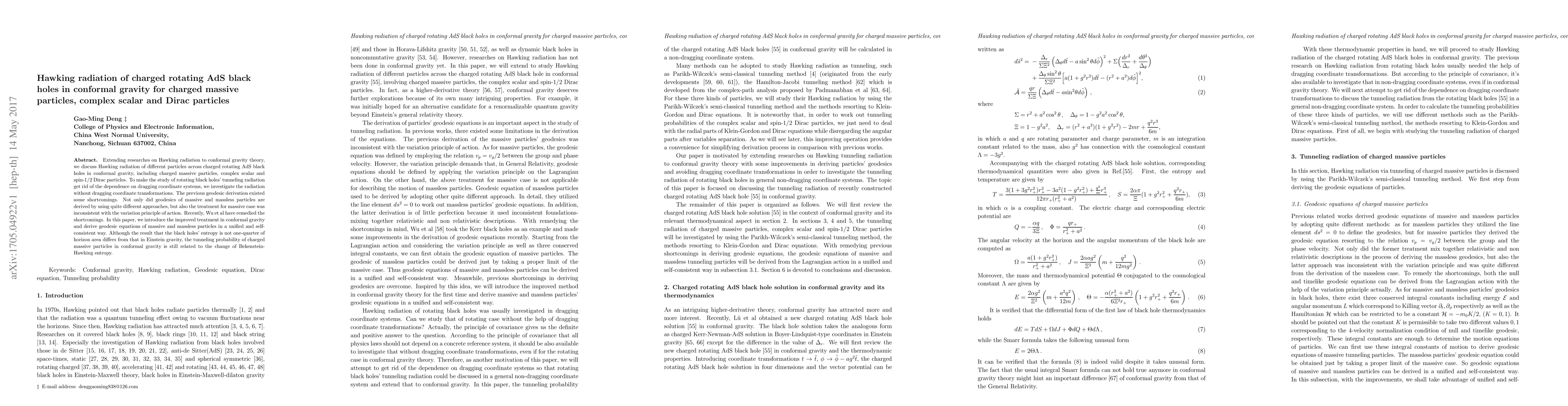 This research extends the study of Hawking radiation to conformal gravity theory, focusing on charged rotating AdS black holes and deriving the Hawking radiation for charged massive particles, complex scalars, and Dirac particles in a unified and self-consistent approach. Despite differences in entropy calculation from Einstein gravity, the tunneling probability for charged particles remains tied to the Bekenstein-Hawking entropy change.