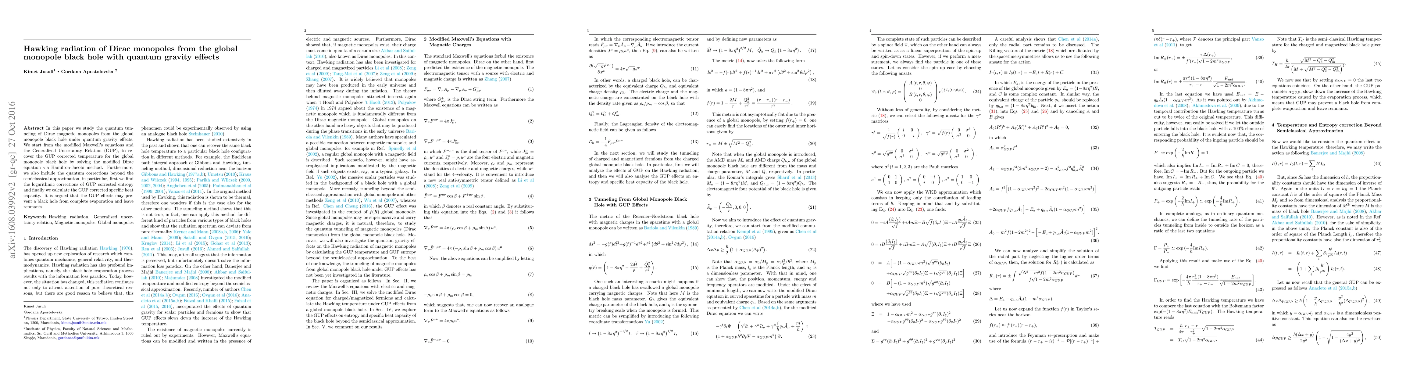 This paper investigates the quantum tunneling of Dirac magnetic monopoles from a global monopole black hole, incorporating quantum gravity effects through the Generalized Uncertainty Principle (GUP). It finds GUP-corrected temperature and entropy, and argues that GUP effects may halt complete black hole evaporation, potentially leaving remnants.