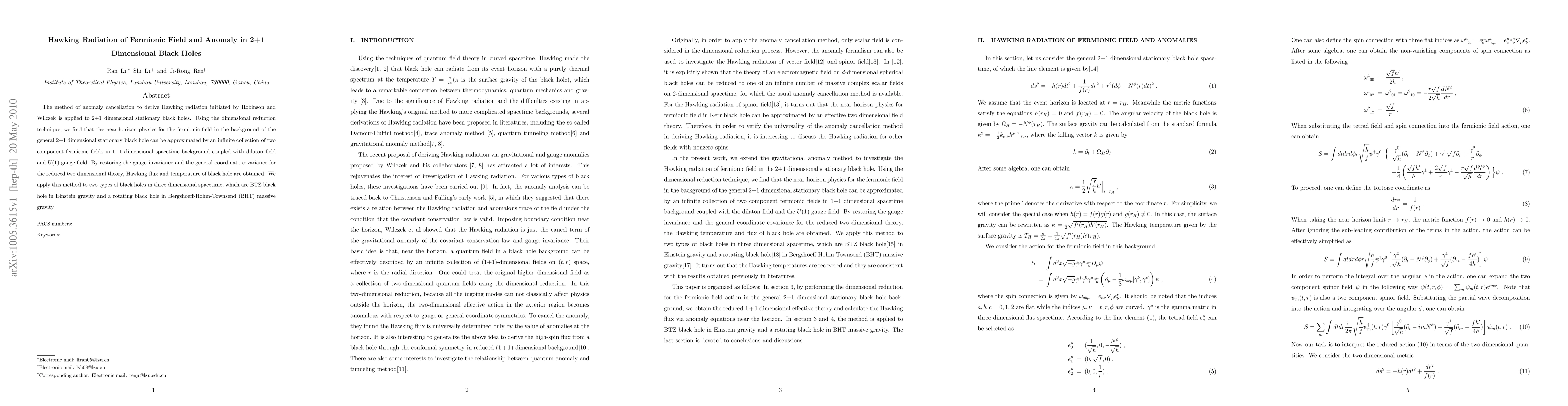 This paper applies anomaly cancellation to derive Hawking radiation for 2+1 dimensional black holes, showing that near-horizon fermionic field physics can be modeled using 1+1 dimensional fields coupled with dilaton and U(1) gauge fields. The method is applied to BTZ and rotating BHT black holes to determine their Hawking flux and temperature.