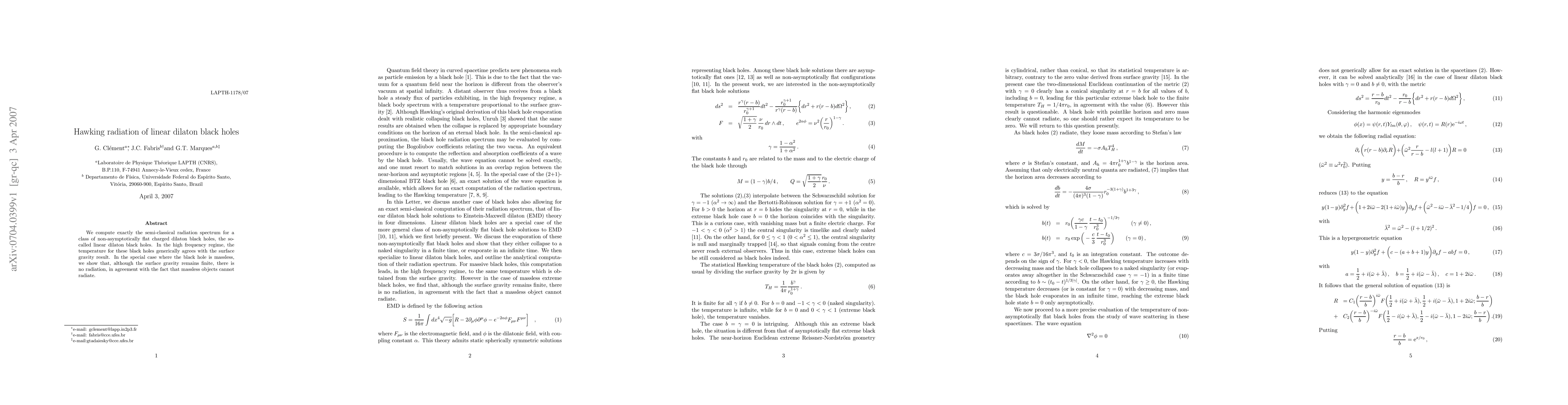Summary: This study computes the exact semi-classical radiation spectrum for linear dilaton black holes, finding that their high-frequency temperature aligns with surface gravity, except for massless black holes, which do not radiate as expected.