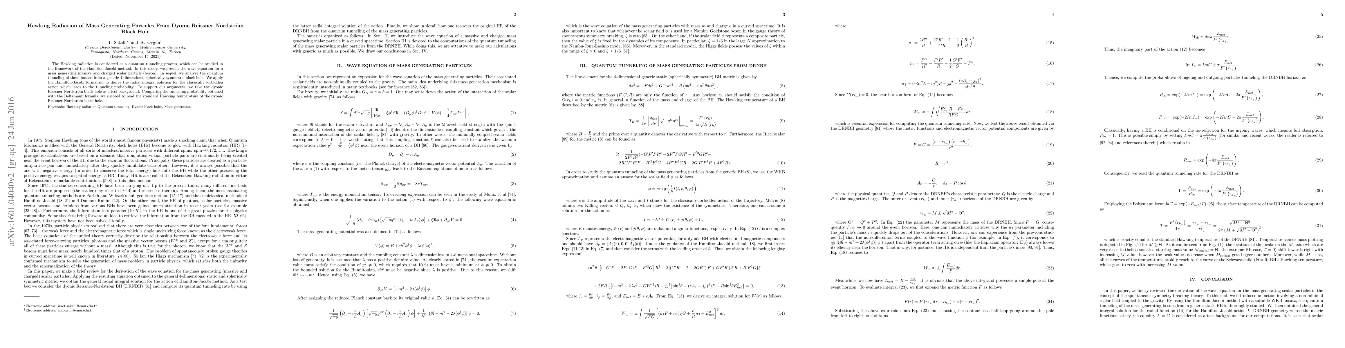 The Hawking radiation is considered as a quantum tunneling process, which can be studied in the framework of the Hamilton-Jacobi method. In this study, we present the wave equation for a mass generating massive and charged scalar particle (boson). In sequel, we analyze the quantum tunneling of these bosons from a generic 4-dimensional spherically symmetric black hole. We apply the Hamilton-Jacobi formalism to derive the radial integral solution for the classically forbidden action which leads to the tunneling probability. To support our arguments, we take the dyonic Reissner-Nordstr\"{o}m black hole as a test background. Comparing the tunneling probability obtained with the Boltzmann formula, we succeed to read the standard Hawking temperature of the dyonic Reissner-Nordstr\"{o}m black hole.