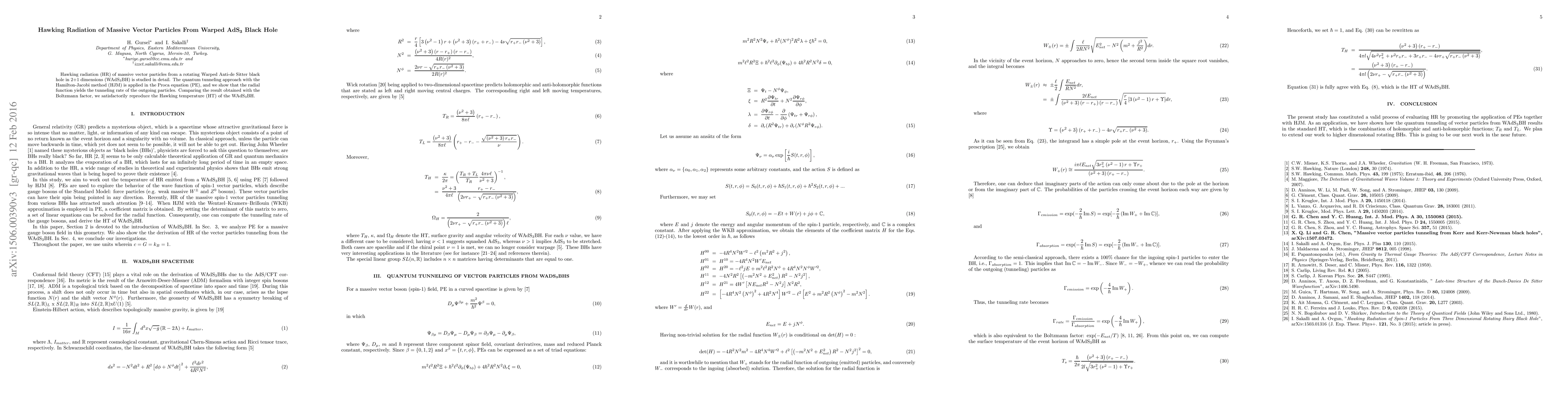 Hawking radiation (HR) of massive vector particles from a rotating Warped Anti-de Sitter black hole in 2+1 dimensions (WAdS$_{\text{3}}$BH) is studied in detail. The quantum tunneling approach with the Hamilton-Jacobi method (HJM) is applied in the Proca equation (PE), and we show that the radial function yields the tunneling rate of the outgoing particles. Comparing the result obtained with the Boltzmann factor, we satisfactorily reproduce the Hawking temperature (HT) of the WAdS$_{\text{3}}$BH.