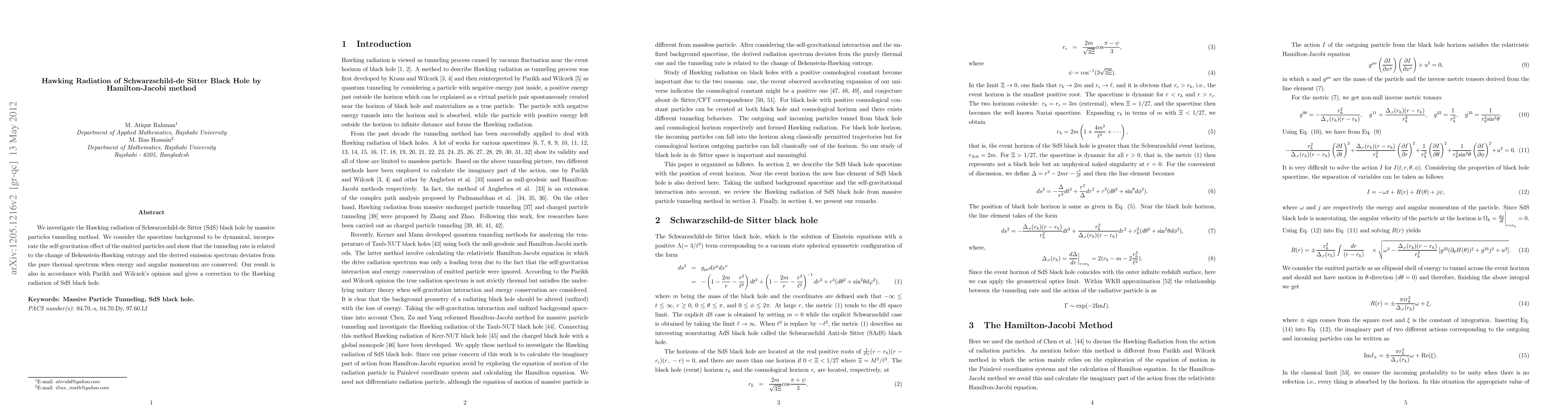 This paper explores the Hawking radiation from a Schwarzschild-de Sitter black hole using the Hamilton-Jacobi method. It finds that the tunneling rate correlates with the Bekenstein-Hawking entropy change and reveals an emission spectrum that deviates from pure thermal due to conserved energy and angular momentum, supporting Parikh and Wilczek's viewpoint and correcting traditional Hawking radiation models.