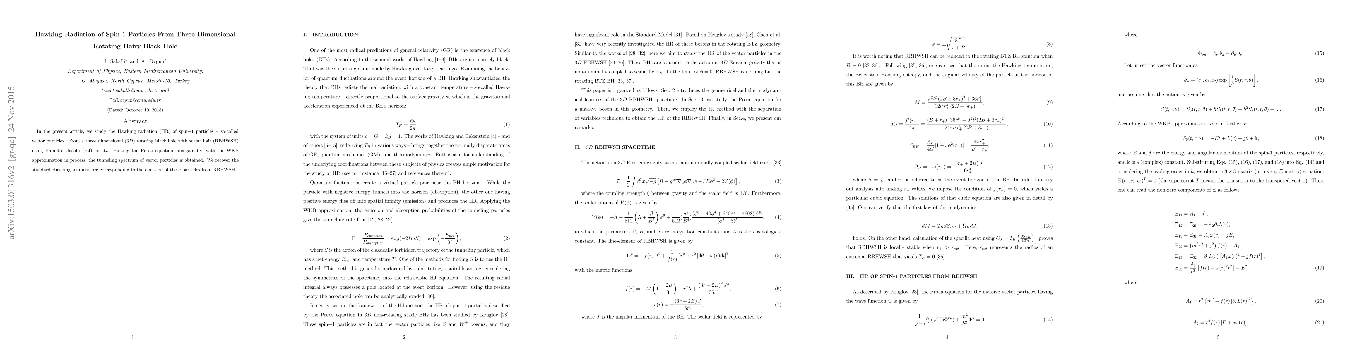 In the present article, we study the Hawking radiation (HR) of spin-1 particles -- so-called vector particles -- from a three dimensional (3D) rotating black hole with scalar hair (RBHWSH) using Hamilton-Jacobi (HJ) ansatz. Putting the Proca equation amalgamated with the WKB approximation in process, the tunneling spectrum of vector particles is obtained. We recover the standard Hawking temperature corresponding to the emission of these particles from RBHWSH.