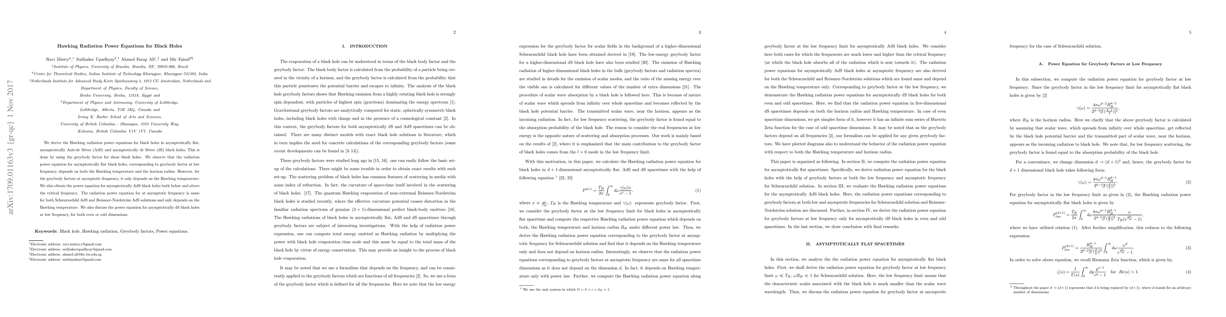 This paper derives Hawking radiation power equations for various types of black holes, including asymptotically flat, AdS, and dS black holes, using greybody factors. It finds that the power equation for flat black holes at low frequency depends on both Hawking temperature and horizon radius, while at high frequency, it depends only on temperature. For AdS black holes, the equation is temperature-dependent at all frequencies. In dS black holes, the low-frequency power equation is discussed for even and odd dimensions.