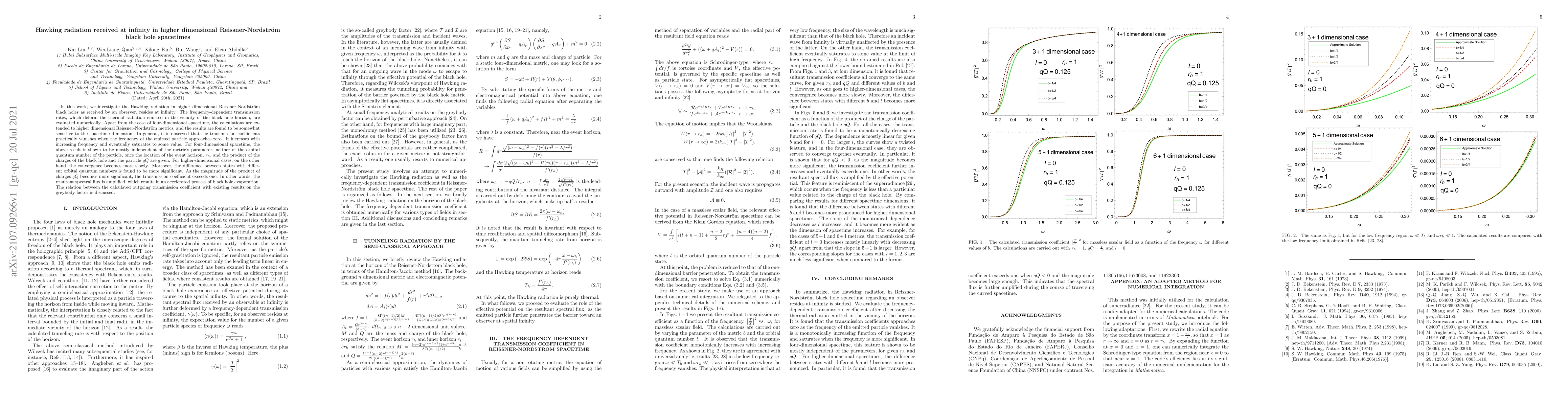 In this work, we investigate the Hawking radiation in higher dimensional Reissner-Nordstr\"om black holes as received by an observer, resides at infinity. The frequency-dependent transmission rates, which deform the thermal radiation emitted in the vicinity of the black hole horizon, are evaluated numerically. Apart from the case of four-dimensional spacetime, the calculations are extended to higher dimensional Reissner-Nordstr\"om metrics, and the results are found to be somewhat sensitive to the spacetime dimension. In general, it is observed that the transmission coefficients practically vanishes when the frequency of the emitted particle approaches zero. It increases with increasing frequency and eventually saturates to some value. For four-dimensional spacetime, the above result is shown to be mostly independent of the metric's parameter, neither of the orbital quantum number of the particle, once the location of the event horizon, $r_h$, and the product of the charges of the black hole and the particle $qQ$ are given. For higher-dimensional cases, on the other hand, the convergence becomes more slowly. Moreover, the difference between states with different orbital quantum numbers is found to be more significant. As the magnitude of the product of charges $qQ$ becomes more significant, the transmission coefficient exceeds one. In other words, the resultant spectral flux is amplified, which results in an accelerated process of black hole evaporation. The relation between the calculated outgoing transmission coefficient with existing results on the greybody factor is discussed.