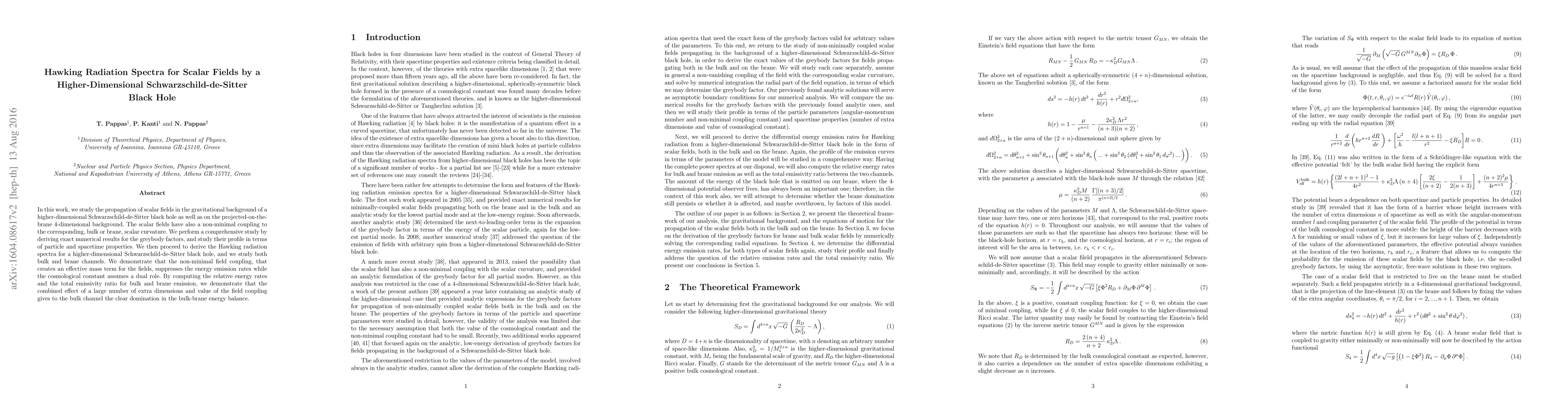 This paper investigates scalar fields in the gravitational field of a higher-dimensional Schwarzschild-de-Sitter black hole, deriving exact numerical results for greybody factors and Hawking radiation spectra. It finds that non-minimal field coupling suppresses energy emission rates, with extra dimensions and field coupling values favoring bulk emission over brane emission.