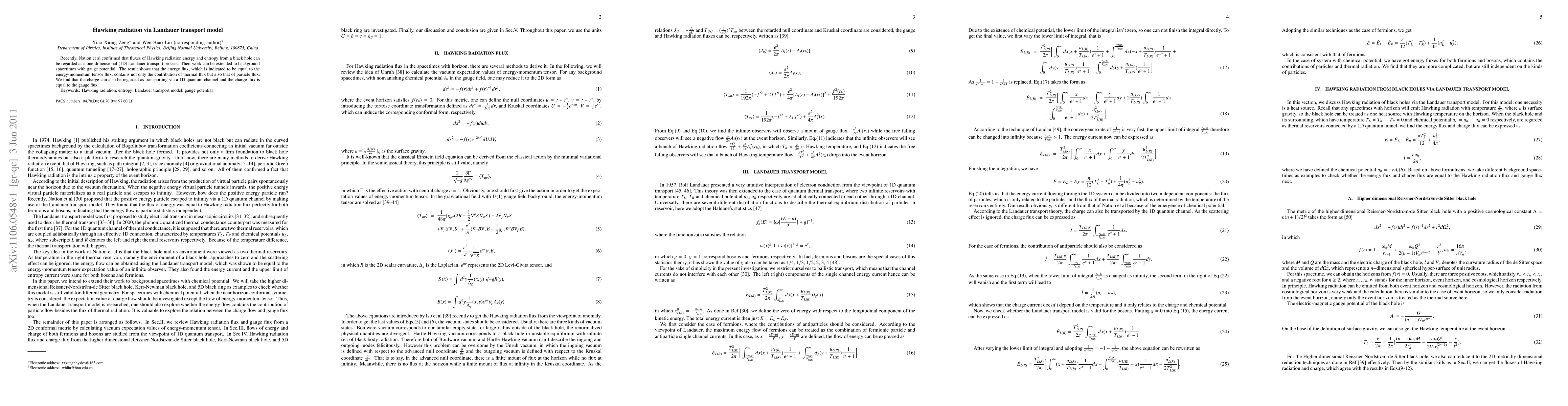 This paper extends Nation et al.'s findings that Hawking radiation energy and entropy fluxes from a black hole can be modeled as a one-dimensional Landauer transport process, showing contributions from both thermal and particle fluxes, along with the charge transport modeled via a quantum channel. The results suggest the charge flux is equivalent to the gauge flux in this theoretical framework.
