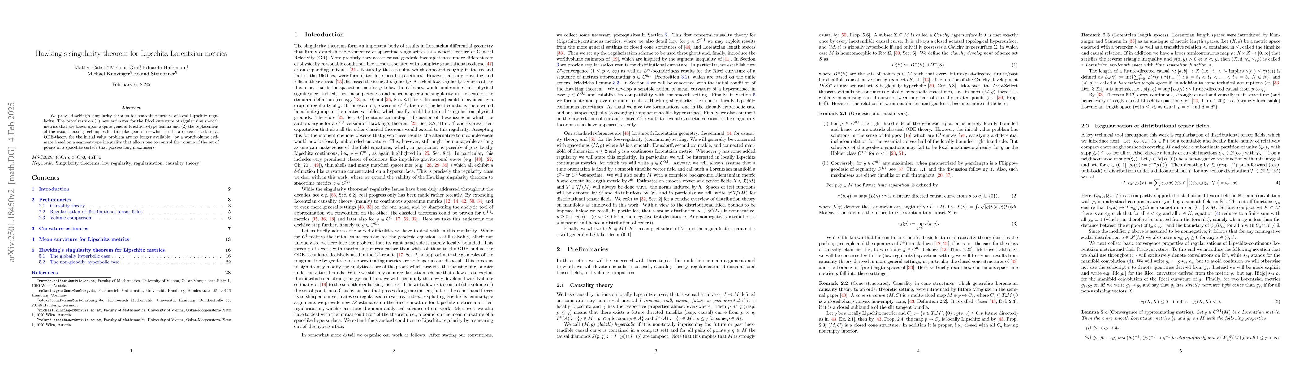 The research proves Hawking's singularity theorem for spacetime metrics of local Lipschitz regularity, utilizing new estimates for Ricci curvature based on a Friedrichs-type lemma and a worldvolume estimate for controlling the volume of points in spacelike surfaces.