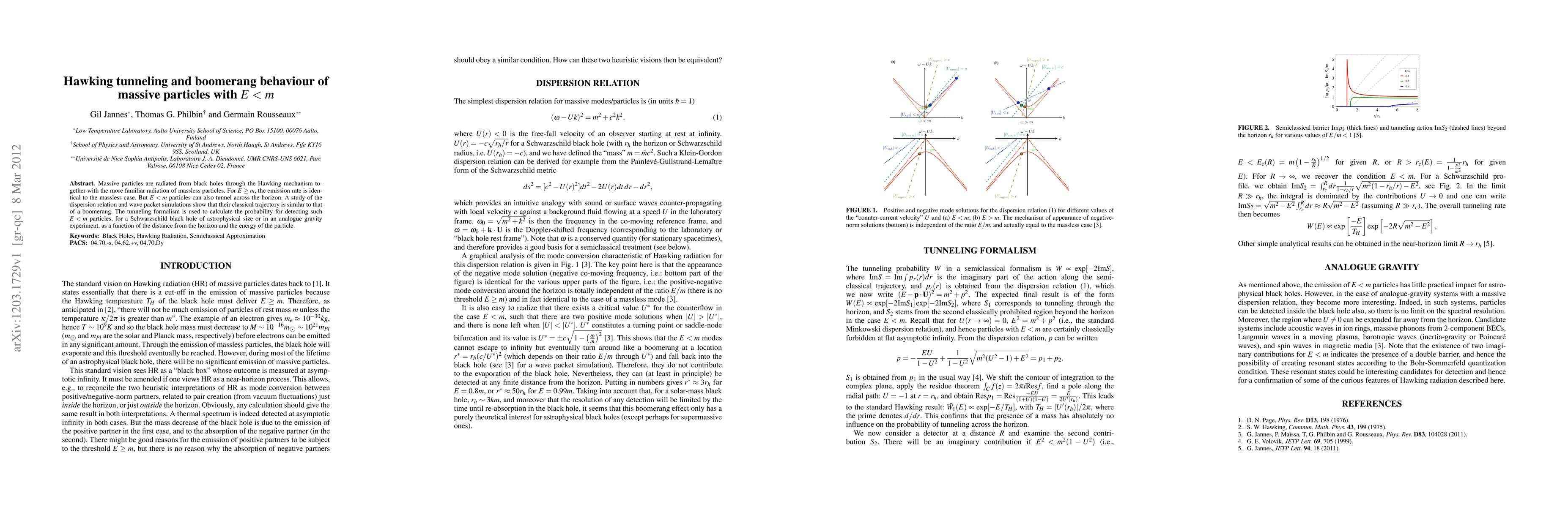 Massive particles are radiated from black holes through the Hawking mechanism together with the more familiar radiation of massless particles. For $E >= m$, the emission rate is identical to the massless case. But $E < m$ particles can also tunnel across the horizon. A study of the dispersion relation and wave packet simulations show that their classical trajectory is similar to that of a boomerang. The tunneling formalism is used to calculate the probability for detecting such $E < m$ particles, for a Schwarzschild black hole of astrophysical size or in an analogue gravity experiment, as a function of the distance from the horizon and the energy of the particle.