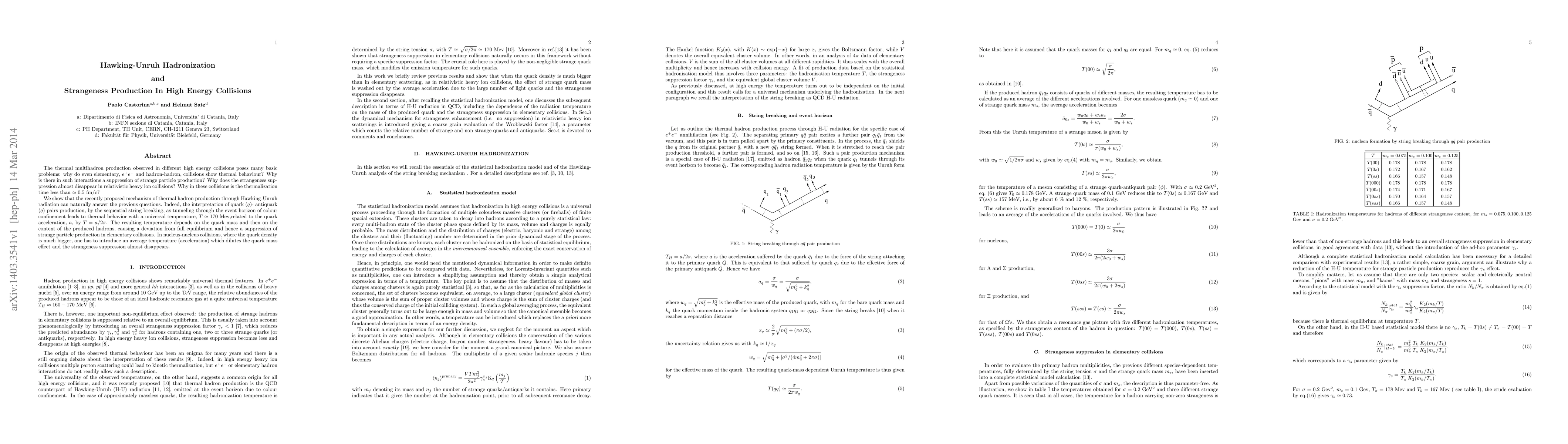 This paper explores the thermal multihadron production in high energy collisions, proposing that Hawking-Unruh radiation explains the observed thermal behavior and suppression of strange particle production. The mechanism of sequential string breaking through event horizon tunneling leads to a universal temperature, which varies with quark mass and affects strangeness production differently in elementary versus heavy ion collisions.