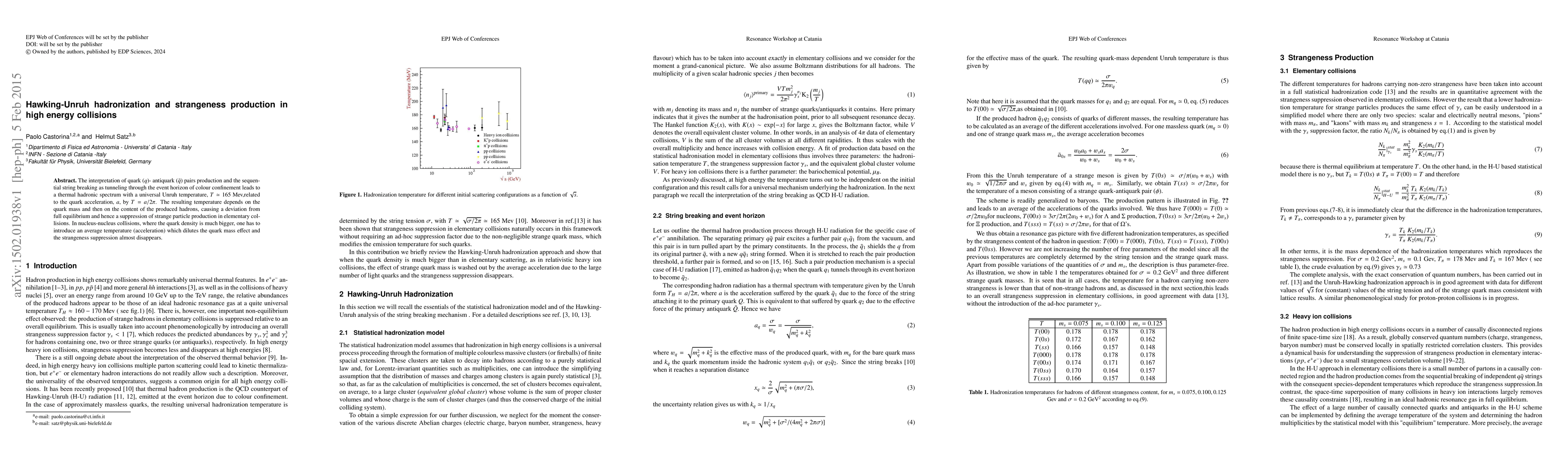 This paper explores the Hawking-Unruh effect in high energy collisions, suggesting that quark-antiquark pair production and string breaking through colour confinement results in a thermal hadronic spectrum with a universal Unruh temperature. The study finds that quark mass influences the temperature, leading to reduced strangeness production in elementary collisions, while this suppression diminishes in nucleus-nucleus collisions due to higher quark density.