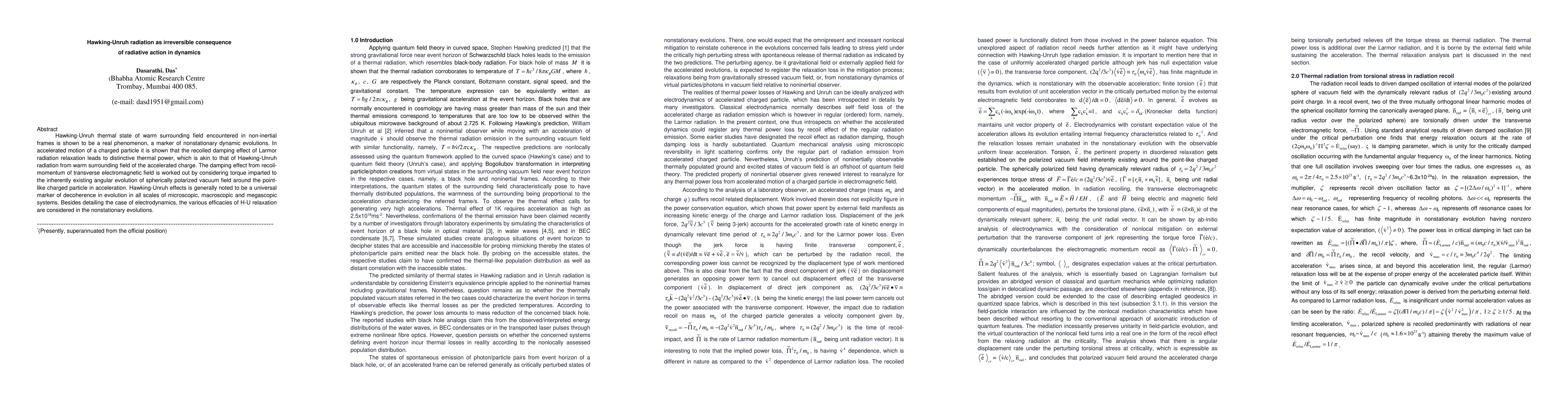Hawking-Unruh thermal state of warm surrounding field encountered in non-inertial frames is shown to be a real phenomenon, a marker of nonstationary dynamic evolutions. In accelerated motion of a charged particle it is shown that the recoiled damping effect of Larmor radiation relaxation leads to distinctive thermal power, which is akin to that of Hawking-Unruh radiation from warm surrounding field of the accelerated charge. The damping effect from recoil-momentum of transverse electromagnetic field is worked out by considering torque imparted to the inherently existing angular evolution of spherically polarized vacuum field around the point-like charged particle in acceleration. Hawking-Unruh effects is generally noted to be a universal marker of decoherence in evolution in all scales of microscopic, macroscopic and megascopic systems. Besides detailing the case of electrodynamics, the various efficacies of H-U relaxation are considered in the nonstationary evolutions.