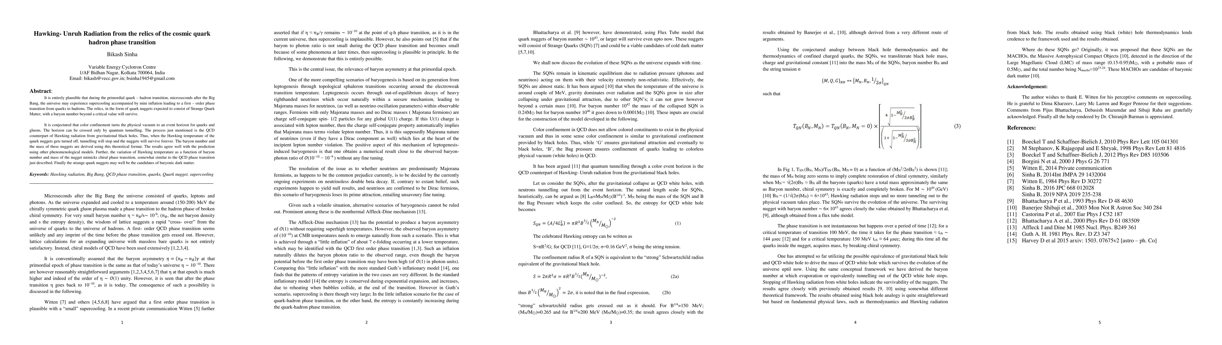 It is entirely plausible that during the primordial quark-hadron transition, microseconds after the Big Bang, the universe may experience supercooling accompanied by mini inflation leading to a first-order phase transition from quarks to hadrons. The relics, in the form of quark nuggets expected to consist of Strange Quark Matter, with a baryon number beyond a critical value will survive. It is conjectured that color confinement turns the physical vacuum to an event horizon for quarks and gluons. The horizon can be crossed only by quantum tunnelling. The process just mentioned is the QCD counterpart of Hawking radiation from gravitational black holes. Thus, when the Hawking temperature of the quark nuggets gets turned off, tunnelling will stop and the nuggets will survive forever. The baryon number and the mass of these nuggets are derived using this theoretical format. The results agree well with the prediction using other phenomenological models. Further, the variation of Hawking temperature as a function of baryon number and mass of the nugget mimicks chiral phase transition, somewhat similar to the QCD phase transition just described. Finally the strange quark nuggets may well be the candidates of baryonic dark matter.