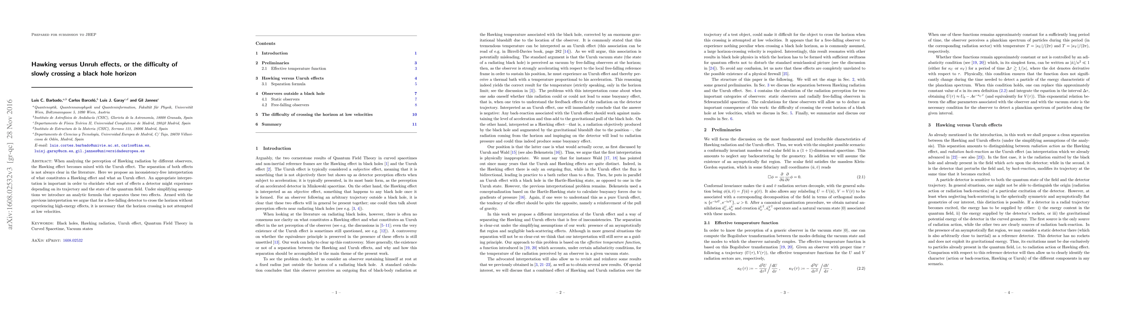 When analyzing the perception of Hawking radiation by different observers, the Hawking effect becomes mixed with the Unruh effect. The separation of both effects is not always clear in the literature. Here we propose an inconsistency-free interpretation of what constitutes a Hawking effect and what an Unruh effect. An appropriate interpretation is important in order to elucidate what sort of effects a detector might experience depending on its trajectory and the state of the quantum field. Under simplifying assumptions we introduce an analytic formula that separates these two effects. Armed with the previous interpretation we argue that for a free-falling detector to cross the horizon without experiencing high-energy effects, it is necessary that the horizon crossing is not attempted at low velocities.