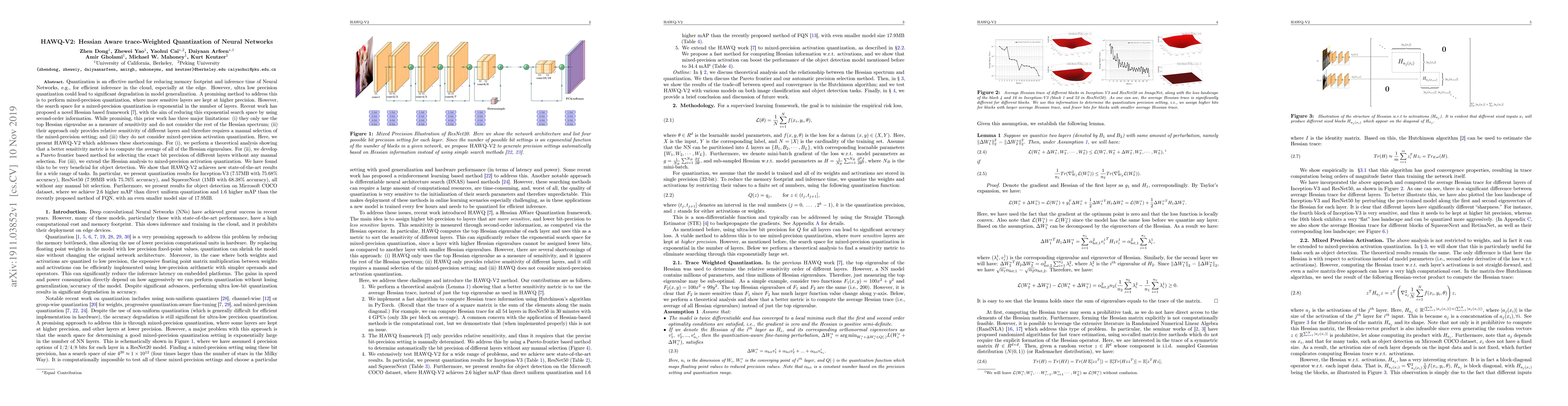 Quantization is an effective method for reducing memory footprint and inference time of Neural Networks, e.g., for efficient inference in the cloud, especially at the edge. However, ultra low precision quantization could lead to significant degradation in model generalization. A promising method to address this is to perform mixed-precision quantization, where more sensitive layers are kept at higher precision. However, the search space for a mixed-precision quantization is exponential in the number of layers. Recent work has proposed HAWQ, a novel Hessian based framework, with the aim of reducing this exponential search space by using second-order information. While promising, this prior work has three major limitations: (i) HAWQV1 only uses the top Hessian eigenvalue as a measure of sensitivity and do not consider the rest of the Hessian spectrum; (ii) HAWQV1 approach only provides relative sensitivity of different layers and therefore requires a manual selection of the mixed-precision setting; and (iii) HAWQV1 does not consider mixed-precision activation quantization. Here, we present HAWQV2 which addresses these shortcomings. For (i), we perform a theoretical analysis showing that a better sensitivity metric is to compute the average of all of the Hessian eigenvalues. For (ii), we develop a Pareto frontier based method for selecting the exact bit precision of different layers without any manual selection. For (iii), we extend the Hessian analysis to mixed-precision activation quantization. We have found this to be very beneficial for object detection. We show that HAWQV2 achieves new state-of-the-art results for a wide range of tasks.