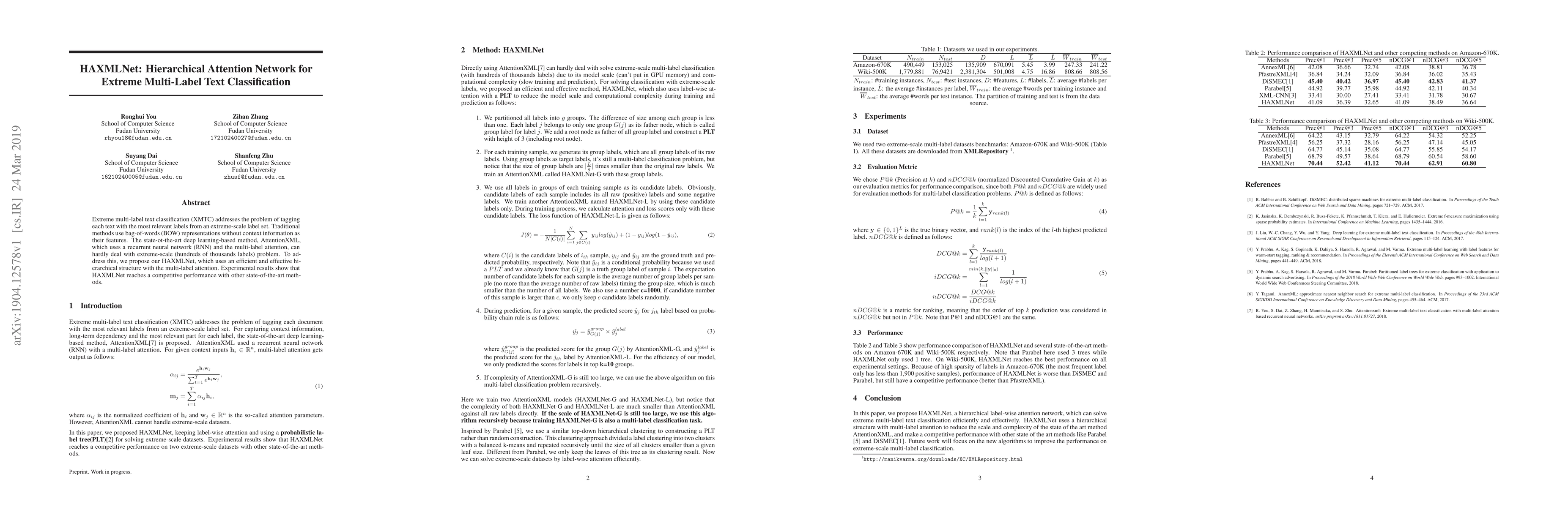 HAXMLNet introduces a hierarchical attention network for extreme multi-label text classification, employing a multi-label attention mechanism to efficiently manage large label sets, outperforming traditional BOW representations and existing deep learning methods. Experimental results indicate competitive performance against the current best methods.