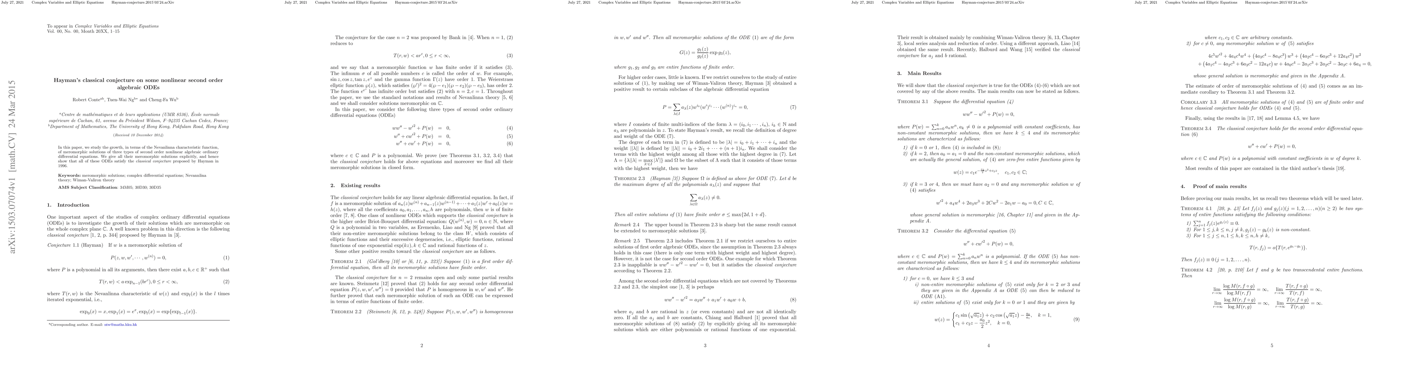 In this paper, we study the growth, in terms of the Nevanlinna characteristic function, of meromorphic solutions of three types of second order nonlinear algebraic ordinary differential equations. We give all their meromorphic solutions explicitly, and hence show that all of these ODEs satisfy the {\it classical conjecture} proposed by Hayman in 1996.