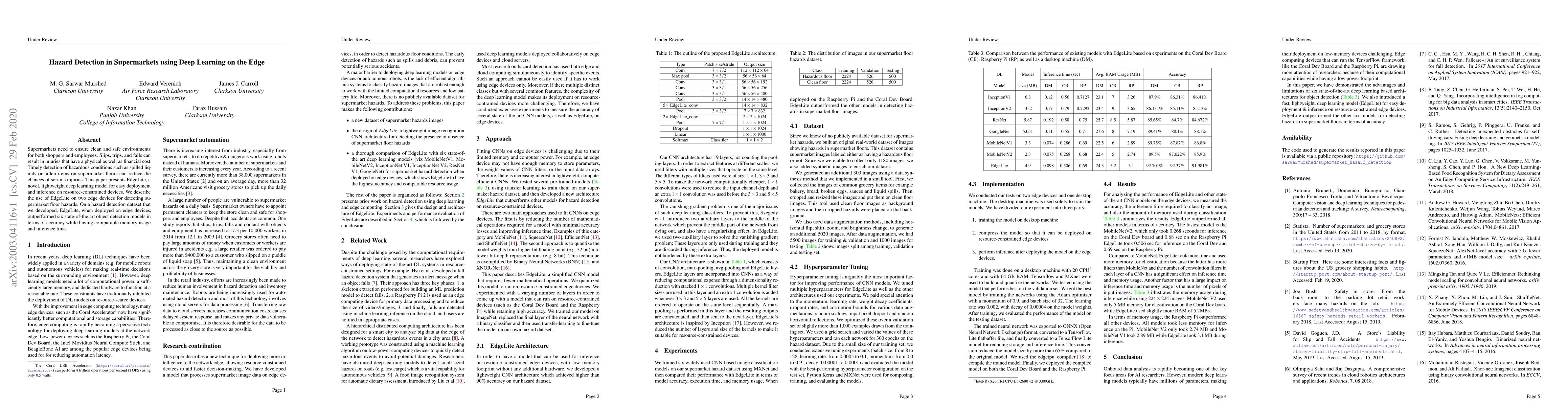 Supermarkets need to ensure clean and safe environments for both shoppers and employees. Slips, trips, and falls can result in injuries that have a physical as well as financial cost. Timely detection of hazardous conditions such as spilled liquids or fallen items on supermarket floors can reduce the chances of serious injuries. This paper presents EdgeLite, a novel, lightweight deep learning model for easy deployment and inference on resource-constrained devices. We describe the use of EdgeLite on two edge devices for detecting supermarket floor hazards. On a hazard detection dataset that we developed, EdgeLite, when deployed on edge devices, outperformed six state-of-the-art object detection models in terms of accuracy while having comparable memory usage and inference time.