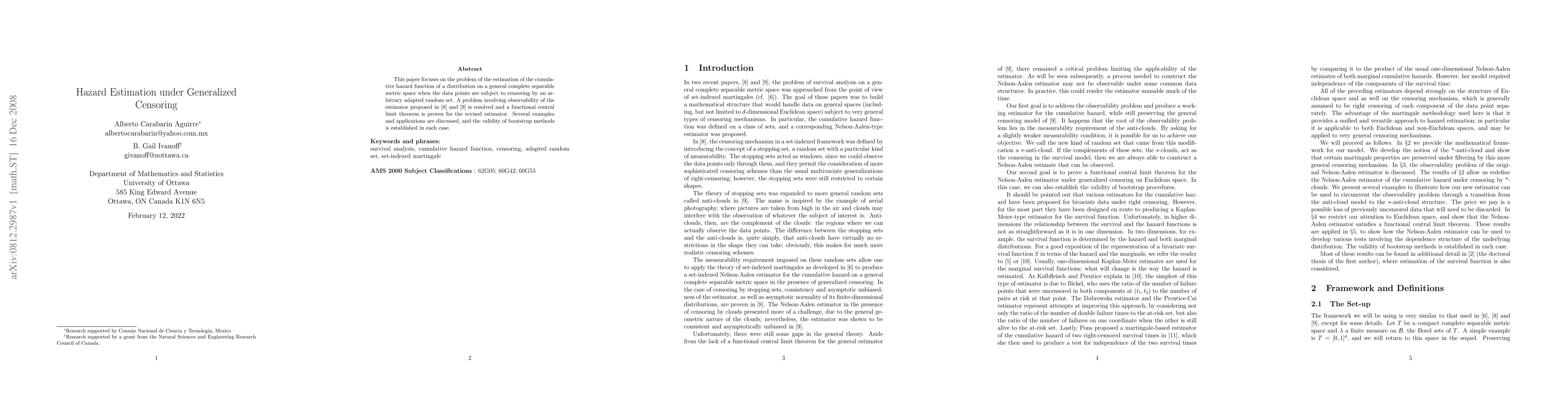 This paper addresses the estimation of the cumulative hazard function under generalized censoring in a complete separable metric space, resolving observability issues and proving a functional central limit theorem for the revised estimator. The study also validates bootstrap methods through various examples and applications.