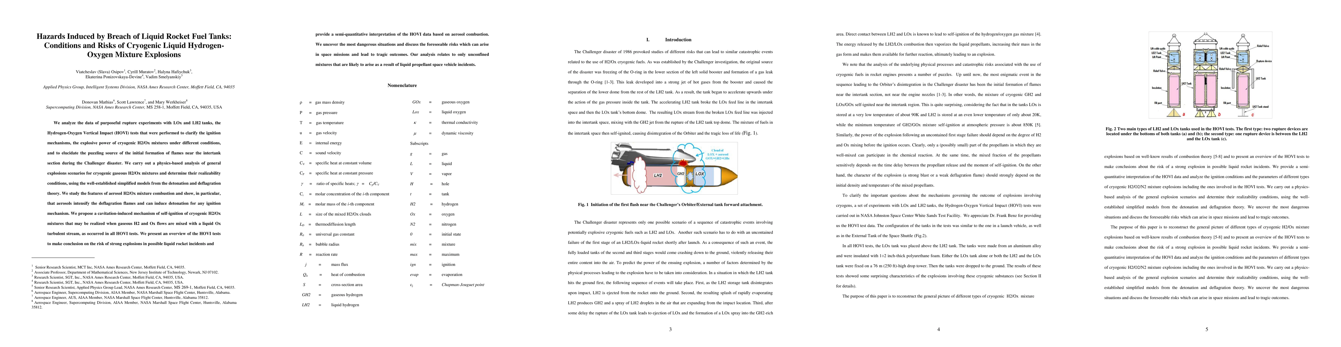 The paper presents a physics-based analysis of cryogenic H2/Ox mixture explosions, revealing that aerosols intensify combustion and can induce detonation. It proposes a cavitation-induced self-ignition mechanism and interprets HOVI test data, identifying dangerous situations and risks in space missions due to liquid propellant vehicle incidents.
