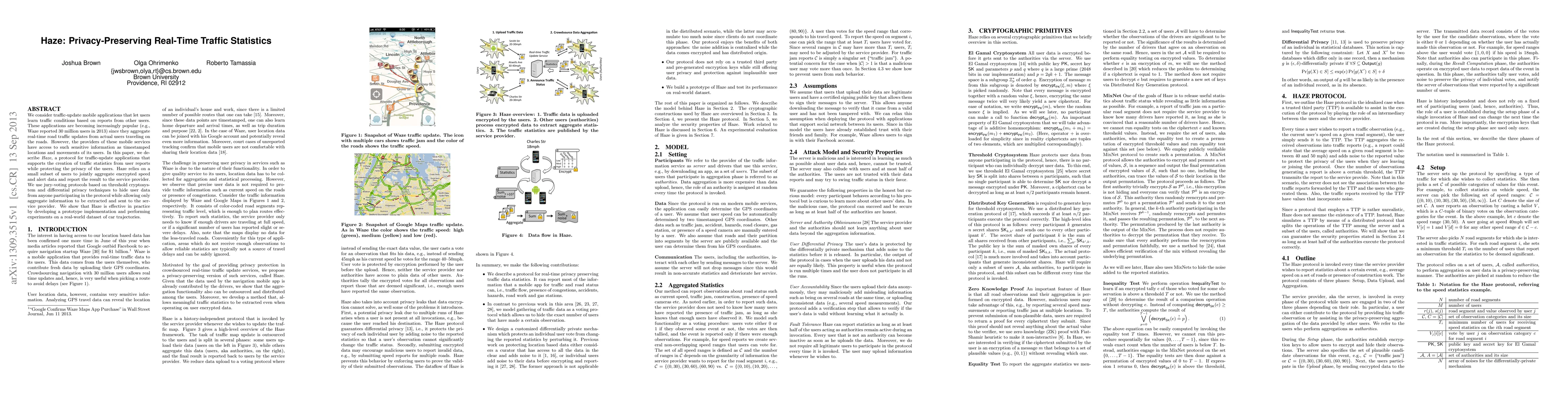 We consider traffic-update mobile applications that let users learn traffic conditions based on reports from other users. These applications are becoming increasingly popular (e.g., Waze reported 30 million users in 2013) since they aggregate real-time road traffic updates from actual users traveling on the roads. However, the providers of these mobile services have access to such sensitive information as timestamped locations and movements of its users. In this paper, we describe Haze, a protocol for traffic-update applications that supports the creation of traffic statistics from user reports while protecting the privacy of the users. Haze relies on a small subset of users to jointly aggregate encrypted speed and alert data and report the result to the service provider. We use jury-voting protocols based on threshold cryptosystem and differential privacy techniques to hide user data from anyone participating in the protocol while allowing only aggregate information to be extracted and sent to the service provider. We show that Haze is effective in practice by developing a prototype implementation and performing experiments on a real-world dataset of car trajectories.