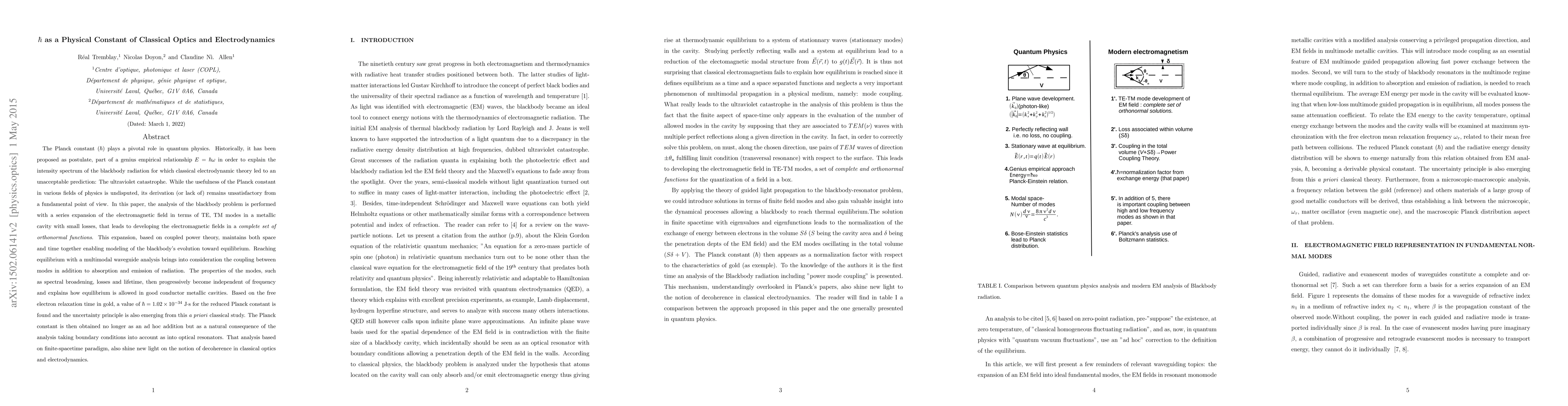 The Planck constant ($\hbar$) plays a pivotal role in quantum physics. Historically, it has been proposed as postulate, part of a genius empirical relationship $E=\hbar \omega$ in order to explain the intensity spectrum of the blackbody radiation for which classical electrodynamic theory led to an unacceptable prediction: The ultraviolet catastrophe. While the usefulness of the Planck constant in various fields of physics is undisputed, its derivation (or lack of) remains unsatisfactory from a fundamental point of view. In this paper, the analysis of the blackbody problem is performed with a series expansion of the electromagnetic field in terms of TE, TM modes in a metallic cavity with small losses, that leads to developing the electromagnetic fields in a \textit{complete set of orthonormal functions}. This expansion, based on coupled power theory, maintains both space and time together enabling modeling of the blackbody's evolution toward equilibrium. Reaching equilibrium with a multimodal waveguide analysis brings into consideration the coupling between modes in addition to absorption and emission of radiation. The properties of the modes, such as spectral broadening, losses and lifetime, then progressively become independent of frequency and explains how equilibrium is allowed in good conductor metallic cavities. Based on the free electron relaxation time in gold, a value of $\hbar = 1.02 \times 10^{-34}$ J$\cdot$s for the reduced Planck constant is found and the uncertainty principle is also emerging from this \textit{a priori} classical study. The Planck constant is then obtained no longer as an ad hoc addition but as a natural consequence of the analysis taking boundary conditions into account as into optical resonators. That analysis based on finite-spacetime paradigm, also shine new light on the notion of decoherence in classical optics and electrodynamics.