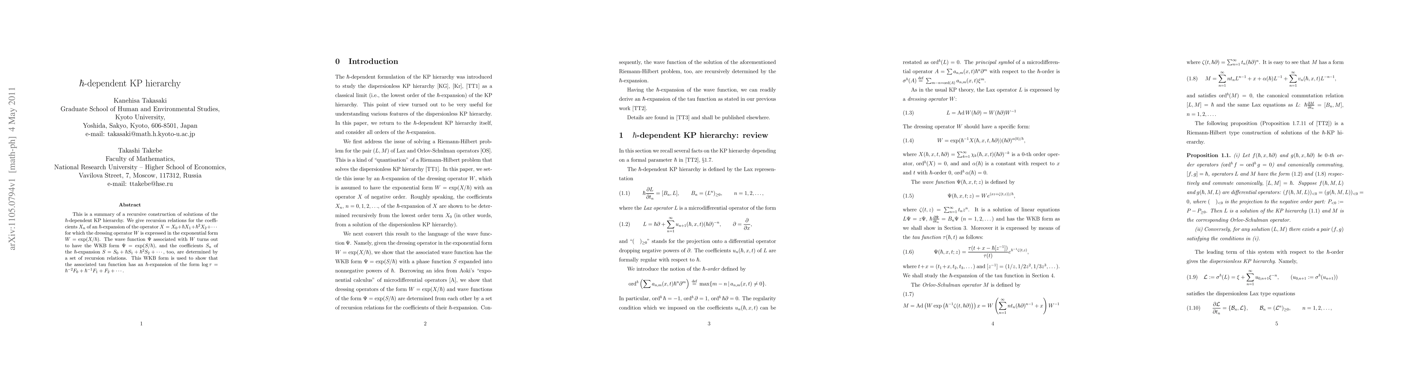 The paper presents a recursive construction of solutions for the hbar-dependent KP hierarchy using recursion relations for the coefficients X_n of an hbar-expansion of the operator X, with the dressing operator W expressed in exponential form.