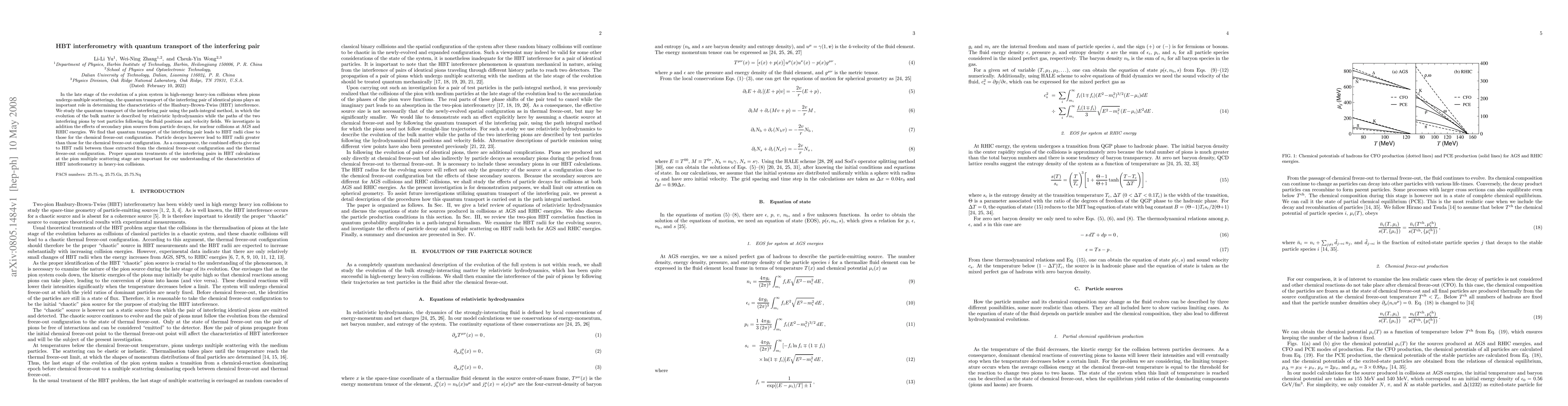 This paper investigates the quantum transport of identical pion pairs in high-energy heavy-ion collisions, finding that it influences Hanbury-Brown-Twiss (HBT) interferometry radii, leading to values between chemical and thermal freeze-out configurations. The study also considers secondary pion sources from decays, which further affect the HBT radii.