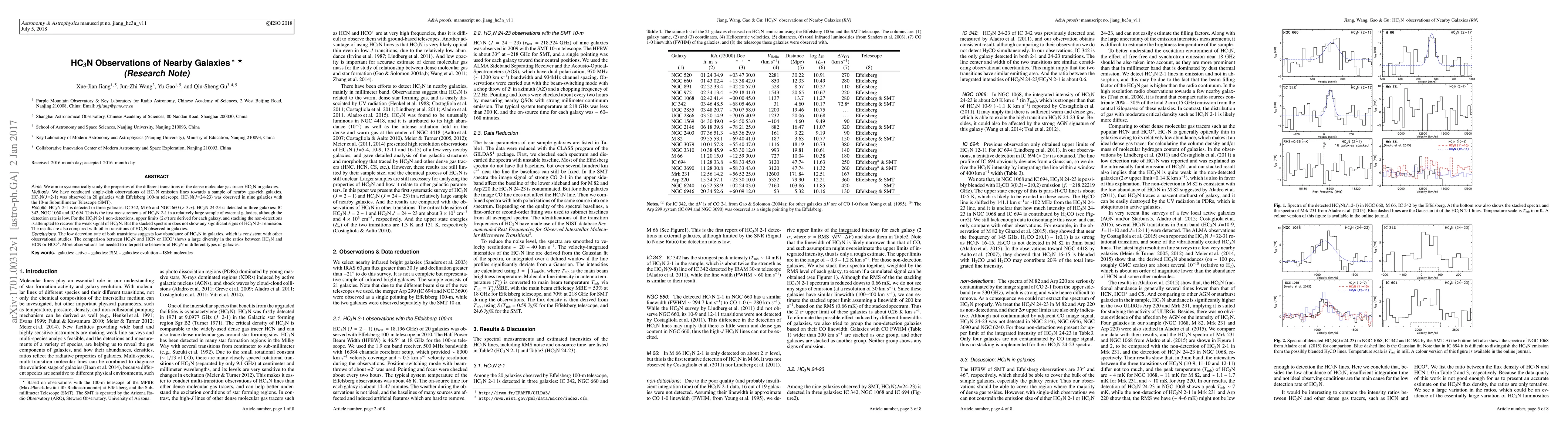 Aims. We aim to systematically study the properties of the different transitions of the dense molecular gas tracer HC3N in galaxies. Methods. We have conducted single-dish observations of HC3N emission lines towards a sample of nearby gas-rich galaxies. HC3N(J=2-1) was observed in 20 galaxies with Effelsberg 100-m telescope. HC3N(J=24-23) was observed in nine galaxies with the 10-m Submillimeter Telescope (SMT). Results. HC3 N 2-1 is detected in three galaxies: IC 342, M 66 and NGC 660 (> 3 {\sigma}). HC3 N 24-23 is detected in three galaxies: IC 342, NGC 1068 and IC 694. This is the first measurements of HC3N 2-1 in a relatively large sample of external galaxies, although the detection rate is low. For the HC3 N 2-1 non-detections, upper limits (2 {\sigma}) are derived for each galaxy, and stacking the non-detections is attempted to recover the weak signal of HC3N. But the stacked spectrum does not show any significant signs of HC3N 2-1 emission. The results are also compared with other transitions of HC3N observed in galaxies. Conclusions. The low detection rate of both transitions suggests low abundance of HC3N in galaxies, which is consistent with other observational studies. The comparison between HC3N and HCN or HCO+shows a large diversity in the ratios between HC3N and HCN or HCO+. More observations are needed to interpret the behavior of HC3N in different types of galaxies.